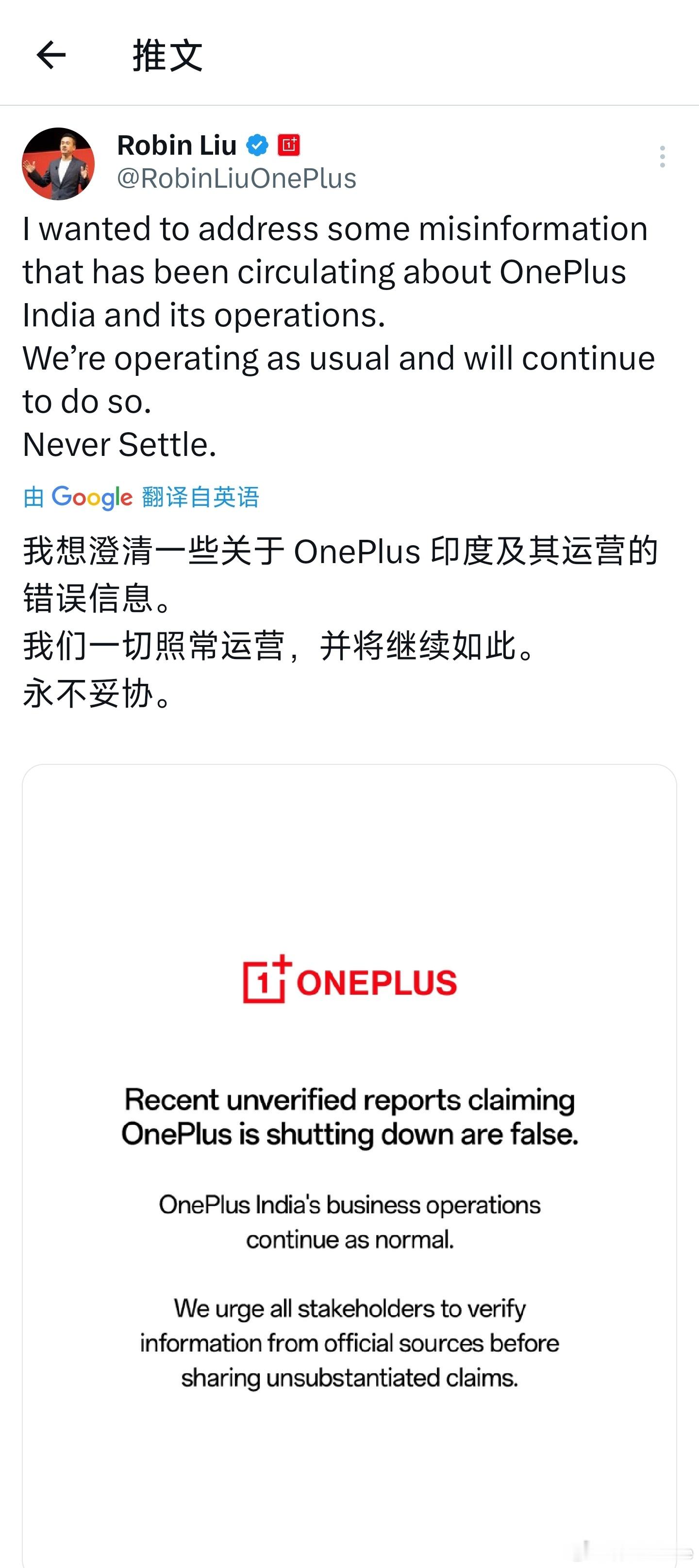 对于近日的一些传闻,一加印度CEO发文回复:一加印度一切照常运营,并将继续如此。