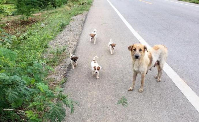 有位小伙开车的时候发现一只流浪狗在街边拦车,他便下了车,没想到的是狗狗带出了它的四个孩子,看来是想求人收养,小伙将一家五口带到了朋友的农场里,腾出了位置给它们住,还给了好吃的食物,狗狗一家看来是饿坏了,吃的狼吞虎咽,感谢这位好心的小伙,让一家五口不再流浪.
