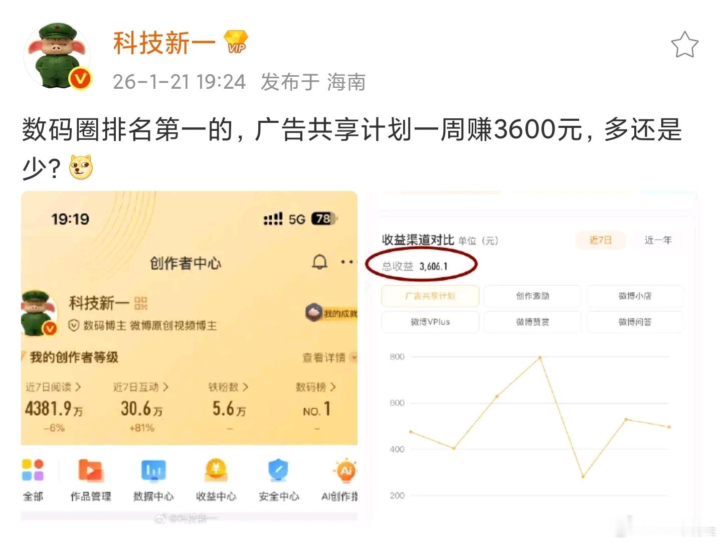 科技新一,数码领域第一,一周能挣3600+;我,上周排在第150名,一周能挣68。