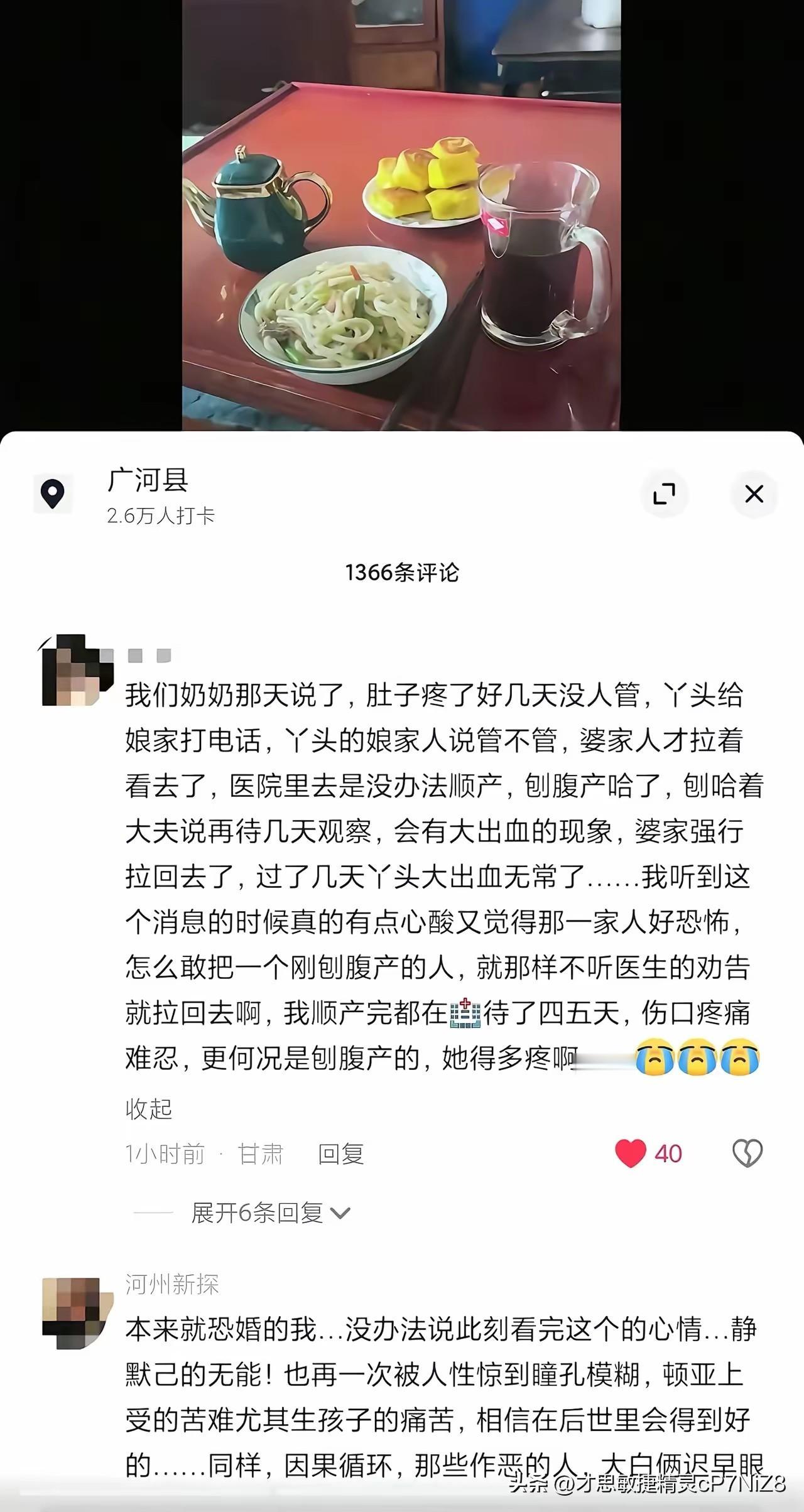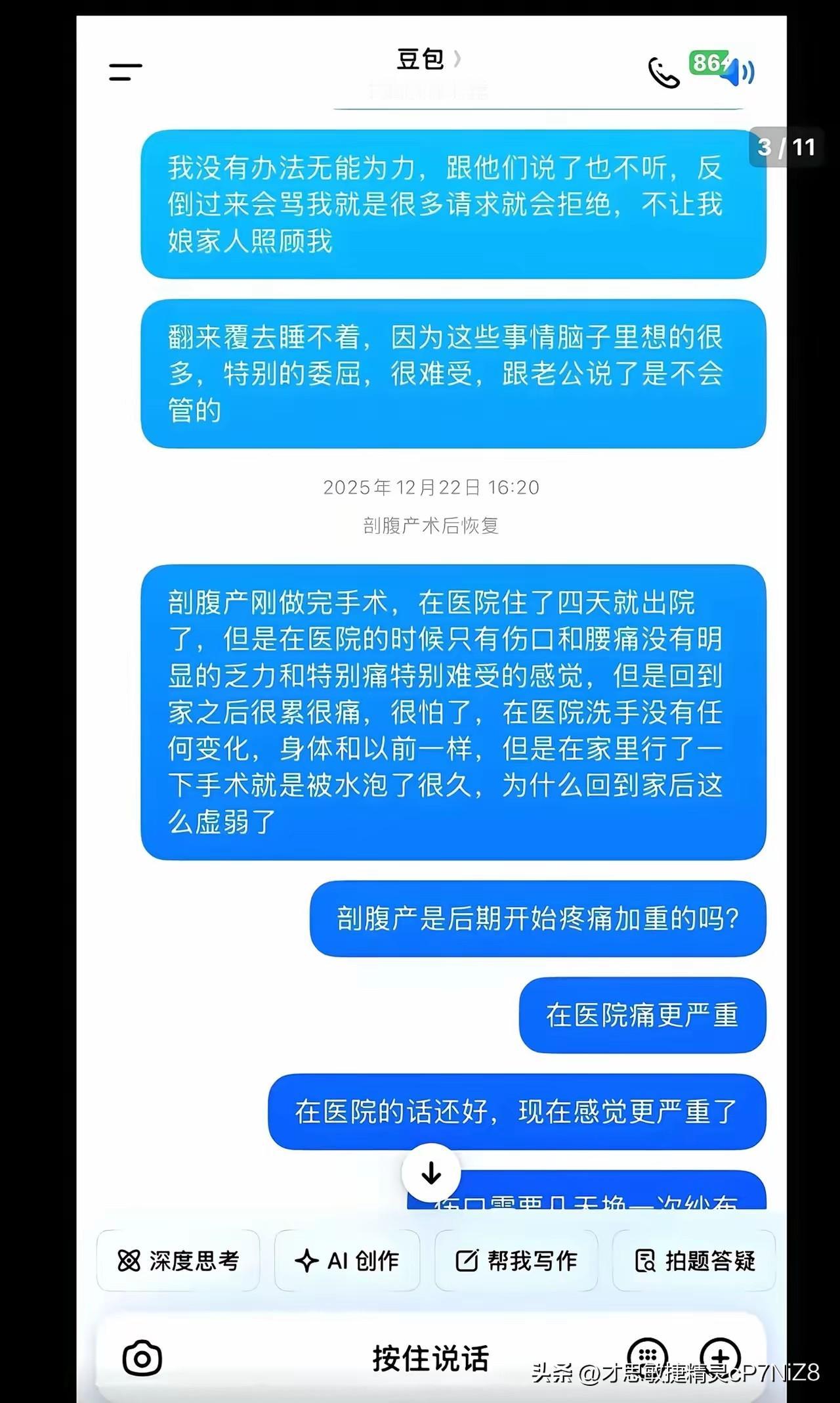 19岁女孩剖腹产4天就出院,还没出月子人就没了,最让人心酸的她无助之际不敢打电话跟妈妈诉苦,只能找豆包倾诉。 起因是甘肃一个19岁的女孩在剖腹产后的第4天,她的婆家不顾医生的反对,要让她带出院回家,而且是在女孩有高血压的状态下。 而她回到家什么待遇呢?她婆家在农村只有土厕,甘肃零下10多度的天气,女孩上厕所没人扶着,让她自己一个出去上旱厕,她只能咬牙忍着疼痛一步一步走上台阶,伤口往出渗着血,纱布也一直都没给换。更别说婆家平时给她吃的也都是些没有营养的食物,娘家人想来照顾,却被婆家人骂走了。 19岁啊!本该是躺在妈妈怀里撒娇、为考试成绩烦恼的年纪,她却要在冰冷的土坯房里,独自对抗剖腹产的剧痛和零下十几度的严寒! 剖腹产的伤口要愈合至少需要两周,医生反复叮嘱的卧床休息、血压监测,在她婆家眼里竟成了“娇气”的代名词。他们到底是不懂医学常识,还是根本没把这个年轻的生命放在心上? 零下10多度的西北农村,寒风能穿透厚厚的棉袄,更别说她刚被切开七层的腹部伤口。每一次起身,每一步挪动,都该是撕心裂肺的疼吧? 渗血的纱布黏在皮肤上,冰冷的空气裹着伤口,她一个人扶着墙,咬着牙走完通往旱厕的路,那种绝望和无助,连倾诉都找不到合适的人,只能对着一个陌生的账号敲下满屏的委屈。 最让人心寒的不是恶劣的环境,而是婆家从头到尾的冷漠。娘家人想来照顾,竟被直接骂走——这哪里是对待刚生完孩子的儿媳,分明是把她当成了用完即弃的工具! 他们舍不得住院费,却舍得让一个19岁的女孩用生命冒险;他们在乎家里的农活和开销,却不在乎这个年轻母亲的死活,这种自私和冷血,真的让人脊背发凉。 女孩为什么不敢跟妈妈诉苦?我想,大概率是当初选择这段婚姻时,没能得到家人的认可吧。 或许是年少懵懂,被一时的甜言蜜语冲昏了头,不顾父母反对执意远嫁,真到了走投无路的时候,既没脸回头求助,又怕妈妈知道后伤心欲绝,只能把所有苦水咽进肚子里,对着陌生的豆包寻求一丝慰藉。 可她不知道,婚姻里最可怕的从来不是贫穷,而是对方家人的不尊重和不心疼。19岁的她,还没来得及看清生活的真相,就被所谓的“婚姻”推向了深渊。 高血压加上产后虚弱,本就是高危状态,再加上伤口感染、营养匮乏、受凉受寒,这些因素叠加在一起,最终酿成了无法挽回的悲剧。如果婆家能多一丝人性,如果她能勇敢地向妈妈求助,是不是结局就会不一样? 这起悲剧从来不是个例,在很多偏远地区,“重男轻女”“女性是生育工具”的封建思想依然根深蒂固。 有些家庭把儿媳当成传宗接代的机器,生完孩子就觉得任务完成,至于产后恢复、身体状况,根本不在他们的考虑范围内。他们忘了,那个刚为家里添丁进口的女人,也是别人捧在手心里长大的宝贝啊! 19岁的生命,本该有无限可能,却永远停留在了月子里。这个悲剧给所有年轻女孩敲响了警钟:婚姻不是儿戏,嫁人不仅仅是选一个伴侣,更是选一个能接纳你、尊重你、心疼你的家庭。 不要因为一时冲动就轻易走进婚姻,更不要在婚姻里委屈自己,当你感受到冷漠和伤害时,一定要勇敢地向家人求助,你的父母永远是你最坚实的后盾。 各位读者你们怎么看?欢迎在评论区讨论。