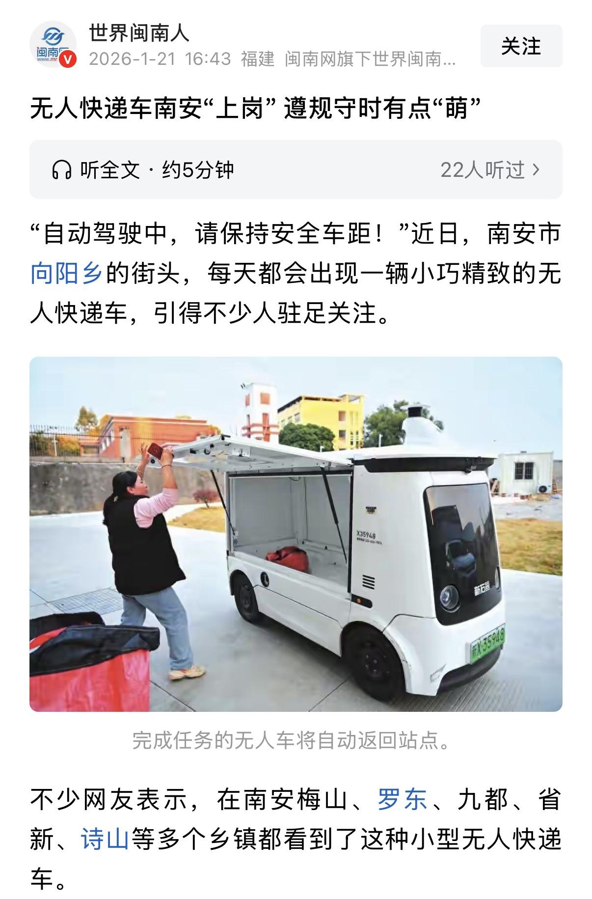 不仅是特郎普惊呆了,连欧洲也坐不住了,原来中国的新能源车只是一个幌子,未来的智能时代才是最大的版图,不知不觉已经和国内产生时代的隔阂了?无人快递车在福建南安“上岗” 2026年1月21日,福建南安的街头出现了一幕颇具未来感的场景:一辆辆呆萌的无人快递车穿梭于梅山、罗东、向阳等乡镇之间。 这不仅是几辆车的试运行,更是中国物流配送从“劳动密集”向“技术密集”转型的一个缩影。 这件事的核心意义,在于它用实打实的数据证明了:在无人配送的赛道上,中国已经把美国远远甩在了身后,我们玩的是“体系”,而美国还在做“实验”。 数据不会说谎,相比传统快递三轮车,无人车的事故率直接下降了70%以上。 它们不知疲倦,满电续航100公里,以30km/h的速度严格遵守交规,精准控制到站时间。 这种“守时”彻底解决了农村配送“最后一公里”因路途遥远、路况复杂导致的时效不稳定问题。 如果把中美无人配送放在一起对比,你会发现这根本不是一个量级的较量。 中国是在搞“基建”,美国则是在做“玩具”。 中国玩家讲究“狂飙突进”。 截至2025年底,仅新石器一家就交付了超过1.6万台无人车,九识、白犀牛紧随其后,全行业累计出货量超3.9万台,预计2026年将飙升至15万台。 反观美国,即便是行业头部Serve Robotics,运营车辆也仅有数百台,每天活跃的更是只有两位数。中国是用“万”作单位,美国还在用“百”挣扎。 美国的无人车聚焦于“最后一公里”的外卖配送,载重仅20-45公斤,更像一个会移动的广告牌,靠广告收入补贴家用,商业模式脆弱且单一。 而中国的无人车(如南安投入使用的车型)载重可达800-1000公斤,容积2-10立方米,直接切入快递分拨中心到驿站的“干线”运输。 这是高频、刚需、大流量的生意。中国拥有全球最复杂、最密集的城市配送需求,这逼出了最强大的技术和最成熟的商业模式。 基于全国快递物流网点,中国无人配送车的市场空间就高达4680亿元; 若算上小区配送,更是达到7280亿元。 而美国市场未来十年预计仅能增长到约1037亿元人民币。 中国的市场体量是美国的数倍,且已经形成了“车、路、云、网、图”的完整生态。 这不仅是效率的胜利,更是工业体系的胜利。 我们不需要像美国那样依赖高精地图的“精密玩具”,我们需要的是能在泥泞乡道、繁华都市中穿梭的“生产工具”。 无人快递车在南安的每一次停靠和出发,都在宣告:在智能物流的新基建上,中国已经抢跑了一个身位。 备注:信源来自于闽南网官方媒体