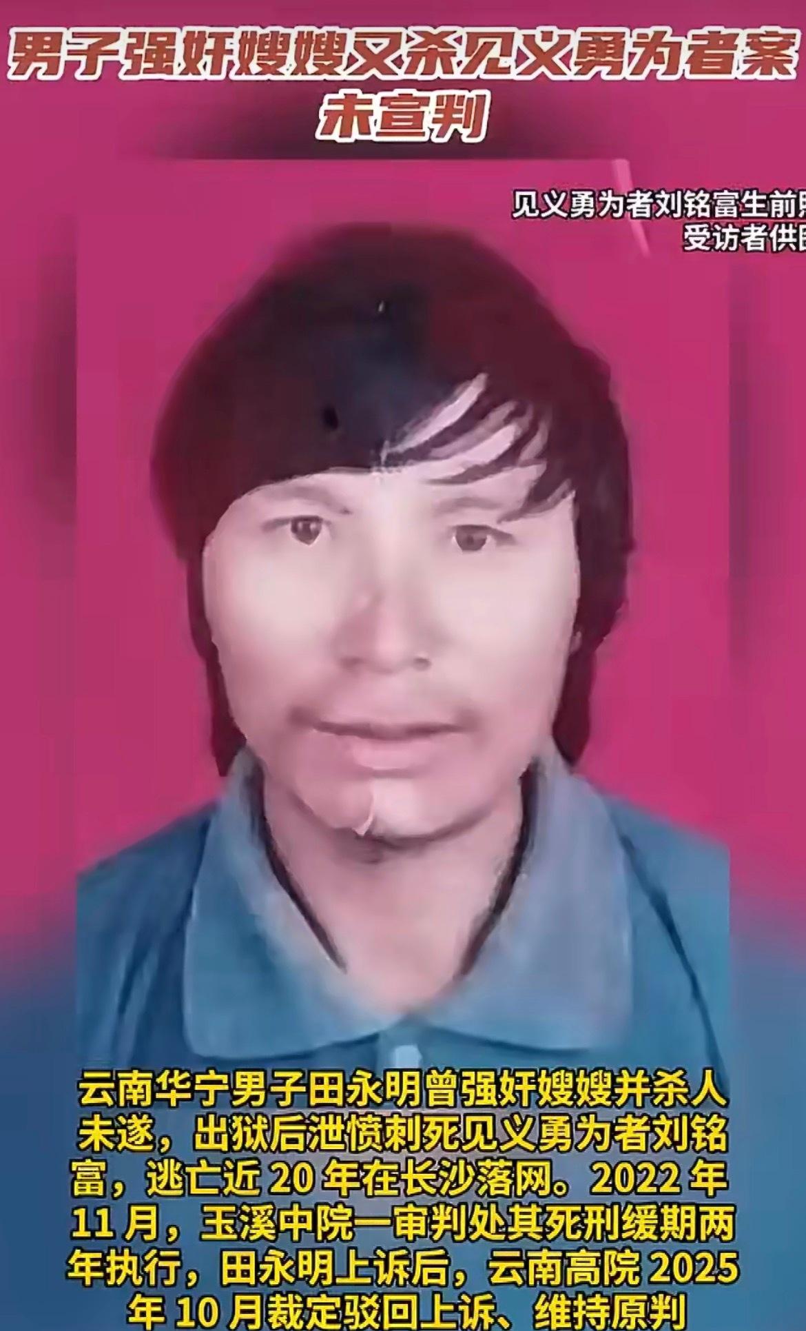 一个人强奸大嫂、出狱后又捅死见义勇为的村民,潜逃二十年被抓后只判了死缓,这样的结果换谁能接受? 嫌犯当初二十岁的时候,趁大哥不在家闯进大嫂房间,拿着刀威胁着实施了强奸,之后还想杀人灭口,好在没得逞。最后他因为强奸、故意杀人未遂这些罪,被判了九年。可没想到,减刑出狱才四个月,他就揣着刀找大嫂报复,路上遇到同村村民挺身劝阻,他二话不说就往人家身上捅,那两刀都扎进了胸腔,直接把人害死了,还把大嫂捅成了轻伤,之后就跑路了,一躲就是近二十年。 直到几年前被抓,一审二审都认定他故意杀人罪成立,可最终判的是死缓。这结果让被害人家属彻底没法接受,见义勇为的父亲没了,家里顶梁柱塌了,凶手却不用一命抵一命。好在省高院后来审查发现,原来的判决量刑明显不当,才启动了再审。庭审上,凶手还在狡辩,说自己不是故意杀人,强奸也是被诬陷,甚至假惺惺地道歉,可被害人家属根本不买账,谁能相信一个毫无悔意的人的道歉? 人家路见不平挺身而出,为了保护别人丢了性命,结果凶手潜逃多年后,量刑却没体现出应有的严惩,这让以后谁还敢见义勇为?法律的意义不仅是惩罚犯罪,更要守住公平正义的底线,要让好人有好报,让坏人付出代价。 我们之所以这么关注这起案子,不是想喊着“以牙还牙”,而是希望法律能给被害人家属一个公道,给所有见义勇为者一个交代,让大家相信,正义或许会迟到,但绝不会缺席。 现在案子还没宣判,大家都在等一个公正的结果。你觉得这起案子应该怎么判才合理?对于保护见义勇为者,你还有什么想说的?欢迎在评论区聊聊你的看法。 来源:红星新闻