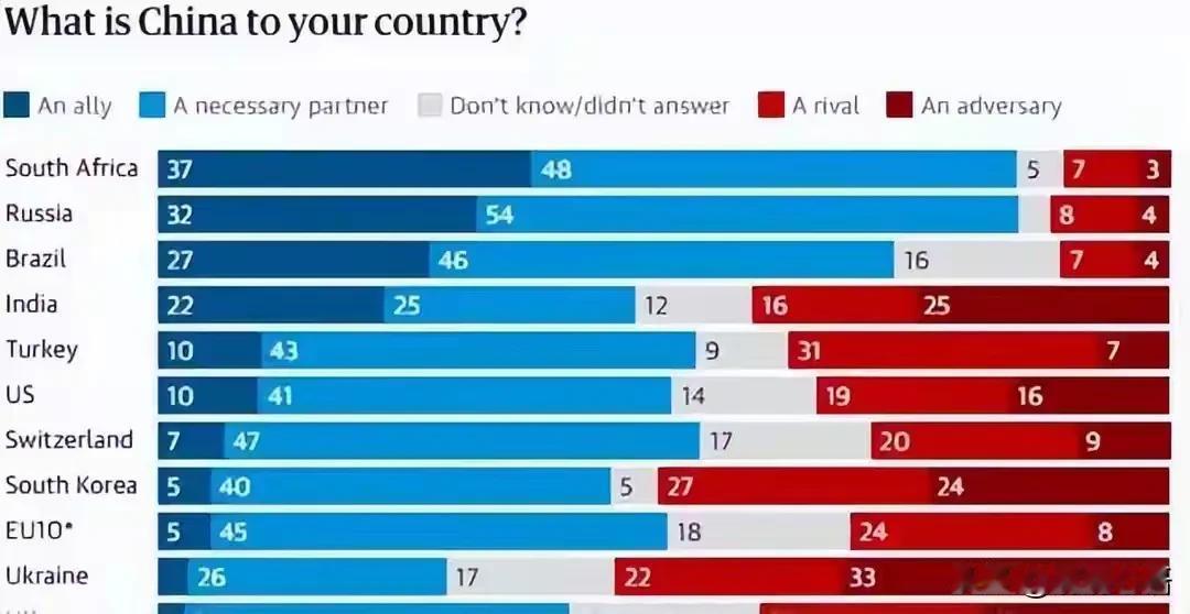 欧洲一记民调砸醒西方:中美国际形象大翻转,这两个国家却成“反华急先锋” 欧洲对外关系委员会最新发布的全球民调结果堪称一场政治地震——当全世界都以为特朗普回归会让中国外交承压时,数据却显示:22%的受访者认为中国影响力将持续上升(+8%),而美国支持率暴跌14%至21%。更戏剧性的是,在调查覆盖的21国中,唯独乌克兰(55%)和韩国(51%)超半数民众将中国视为“对手”,这种反常现象背后藏着耐人寻味的逻辑。 先说大局。发展中国家对中国的好感度简直“开挂”:南非83%、巴西72%的民众看好中国影响力,这些地方不玩虚的,中国建的铁路、电站就杵在那儿。就连与我们有边境摩擦的印度,多数人也只把中国当谈判对象而非死敌。欧洲人虽然抱怨产业竞争,但真抡起意识形态大棒时反倒犹豫——毕竟德国车企30%销量靠中国市场,谁会和饭碗过不去? 但乌克兰和韩国成了例外。乌方情绪容易理解,战争状态下非黑即白的舆论场里,中国拒绝选边站队就被解读为“亲俄”。可韩国这数据就魔幻了:54%视美国为盟友,却对隔壁的亚洲最大贸易伙伴充满警惕。细想也不奇怪:驻韩美军经营70年,连泡菜都要申遗的文化焦虑下,中国渔船越界捕捞这种小事都能被放大成“国家威胁”。更讽刺的是,韩国半导体40%出口目的地是中国... 这份报告最狠的结论在于:特朗普的“美国优先”战略正在给中国送助攻。当欧盟发现美国人连盟友都要加征钢铝关税时,中国“不结盟、不折腾”的稳定性反而成了加分项。如今连俄罗斯人对欧盟的敌意(51%)都超过了对美国(37%),世界正在用脚投票——多极化浪潮里,死抱冷战思维的国家,终将成为孤岛。