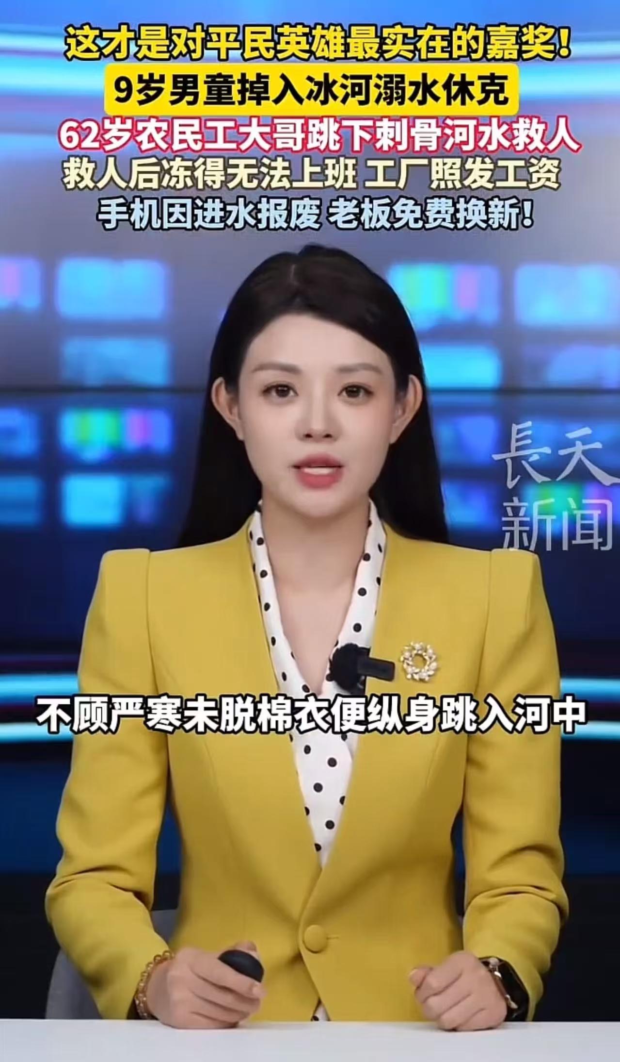 “这才是对平民英雄最实在的嘉奖!”9岁男孩冰河溺水,62岁农民工跳入刺骨河水救人,冻到无法上班,老板却说:“工资照发,手机我赔!”全网怒赞:这个老板真有格局! 寒冬腊月,气温仅3℃,9岁的小宇(化名)和妹妹在河边玩耍,不慎掉入河里。 孩子不会游泳,挣扎几下后,只留下水面一圈圈绝望的涟漪。 妹妹吓得魂飞魄散,跑到附近一家水泥厂求救:“救命啊!我哥哥掉河里了!快救救他!” 话音未落,62岁的农民工龙相臣和45岁的代艳合已冲出工棚! 龙相臣来到河边,连外套都没脱,直接纵身跃入冰河! 河水像刀子一样割皮肤,寒气直钻骨髓。可他咬紧牙关,一遍遍潜入、探摸。 整整5分钟,生死时速!终于,在靠近岸边的淤泥里,龙相臣一把抓住孩子的衣角! 可孩子被救上岸后,脸色青紫,嘴唇发白,呼吸全无,身体冰冷僵硬——已经休克! 妹妹扑上来嚎啕大哭:“哥哥!你别睡!你睁开眼看看我啊……” 千钧一发之际,龙相臣跪在冻土上,凭着电视里看过的片段,开始给男孩做心肺复苏。 围观群众屏息凝神,时间仿佛静止…… 突然——“哇!”一声微弱却清晰的啼哭划破寒空! 男孩吐出一口河水,胸口起伏,眼睛缓缓睁开! “活了!孩子活了!”人群爆发出震天欢呼。妹妹紧紧抱住哥哥,哭得几乎晕厥。 而两位英雄,浑身湿透、嘴唇发紫,瘫坐在地,冻的无法上班。 他们心里焦急:“耽误工期,怕要扣工资……” 可他们的老板得知两人的英雄事迹后后,当场拍板:“人你们是英雄!工资一分不少,安心休息!” 更暖心的是,龙相臣发现自己的旧手机因泡水彻底报废,老板竟二话不说,自掏腰包买了一部新手机奖励他! 消息传开,全网沸腾,评论区满是敬意与泪目: “这才是真正的‘以人为本’!老板格局炸裂,工厂虽小,人心滚烫!” “62岁啊!多少人这个年纪在家享清福,他却敢跳冰河救人!致敬平凡英雄!” “老板不只发工资,还赔手机——这不是作秀,是发自内心的尊重!这样的企业,活该兴旺!” 被救的小孩家属不管家境好不好,最起码应该表示感谢救命之恩,怎么没有看到相关新闻! 危险时刻,两个平民英雄挺身而出,挽救了一个家庭! 你的善举,我来兜底;你的损失,我来承担。这才是对平民英雄最实在、最体面的嘉奖—— 不是挂在墙上的锦旗,而是落到手里的尊严;不是事后的表彰,而是事中的守护。 一个社会是否文明,不看它如何对待精英,而看它如何回馈那些默默无闻却敢于挺身而出的普通人。 致敬龙相臣、代艳合——你们冻僵的身体,焐热了整个冬天;你们粗糙的双手,托起了生命的奇迹。 也致敬那位老板——你发的不是工资,是良知;你送的不是手机,是敬意。 愿这样的善,被看见、被传递、被制度性保障。因为每一次对英雄的温柔以待,都是在为下一次挺身而出铺路!