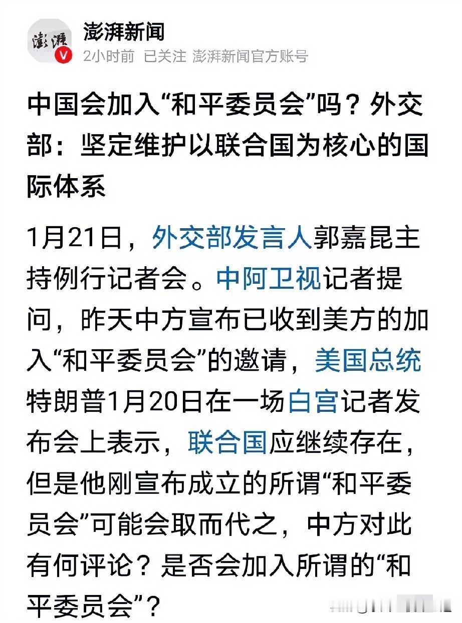 古特雷斯不参加, 中国不参加, 法国不参加, 加拿大不参加, 巴西不参加, 中亚五国不参加… 所谓的发出60多个国家的帖子, 无数国家并没有表态! 纵观整个世界,美国唱戏, 全世界看戏! 号称给60多个国家发了入会邀约,如今就匈牙利一国明确应下,加拿大嘴上松口却咬死一分钱不缴,其余国家不是直拒就是闷声装没看见,这般应者寥寥,满是实打实的窘迫。 美国扯着加沙和平的幌子张罗这一局,自己坐稳终身主席还攥着一票否决权,暗设10亿美元买永久席位的门槛(据环球网1.18报道),章程里压根不提加沙议题,反倒要伸手插手全球所有冲突地带。 联合国秘书长古特雷斯连正式邀约都没收到,早前就反复强调国际事务该由联合国主导,这般缺席从不是巧合,是铁了心守定多边主义底线,不给他家单边操作站台。 马克龙直言这委员会越联合国框架不合国际法,转头就遭特朗普放狠话,要对法国葡萄酒加征200%高额关税(据新华社1.19报道),一边谈规则一边耍蛮横,霸权者的真面目藏都不藏。 中国始终认联合国的核心协调作用,不掺和这种绕开多边体系的小圈子,这份沉默从来不是态度模糊,是和多数国家一样,信公道公理,不信霸权强权的明确立场。 中亚五国守着亚欧交界的地缘要地,深知地区和平靠平等协商不靠选边站队,直接拒绝参会,就是不愿被绑上美国谋私利的战车,平白给自家添无妄纷争。 巴西说要先顾南美区域的民生诉求,加拿大干脆明着敷衍应付,这般推三阻四,全是看清了本质,这所谓委员会不是谋和平,是美国想攥紧全球话语权的私心罢了。 那些没吭声的国家从来不是懦弱,心里都揣着一杆公平秤,不愿做戏台子上的背景板,不愿被裹挟着站队,更不愿亲手砸了当下多边共识的根基。 这些年美国本就退群成瘾,66个国际组织说退就退(据白宫1.7备忘录),退世卫、退巴黎协定全是老操作,如今急着拉群另立规矩,把国际平等协作搞成利己的强权游戏。 明明打着加沙战后治理的旗号,却对加沙民众盼的人道援助、家园重建只字不提,满心满眼都是如何掌权、如何敛财,这般赤裸裸的虚伪,谁都瞧得明明白白。 西方不少外交官早戳破这层窗户纸,直言这就是特朗普版的“私人联合国”,无视联合国宪章基本原则,满心就想架空公认平台,行霸权独断之实。 当下世界早不是美国一家说了算的年代,小国不愿再做强权附庸,大国坚守多边底线不动摇,靠霸权撑起来的热闹场子,说到底不过是自导自演的独角戏。 和平从不是某国的一言堂,也不是花钱能买到的席位,是所有国家平等对话、各让一步的真心诚意,靠算计和强权堆起来的局,终究成不了真事儿。 你觉得美国牵头的这所谓和平委员会,本质是为解决冲突还是谋夺霸权?欢迎在评论区说说你的看法。