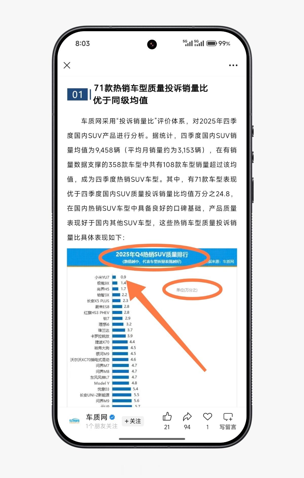 小米YU7获得SUV质量排名第一 车质网采用“投诉销量比”评价体系,对2025年四季度国内SUV产品进行分析。小米YU7凭借万分之0.9的投诉销量比,登顶第一。要知道这是车质网从市售358款SUV车型中选取108款热销车型,再从108款中再筛选出71款“投诉销量比”优于国内(第四季度)平均值的车型。换句话说,这个评分客观反映小米YU7既能热销的同时,仍然能取得“投诉销量比”最低的好成绩,用实力打破“卖得好难免投诉多”的魔咒。YU7的品控经得起市场的严苛检验。👏