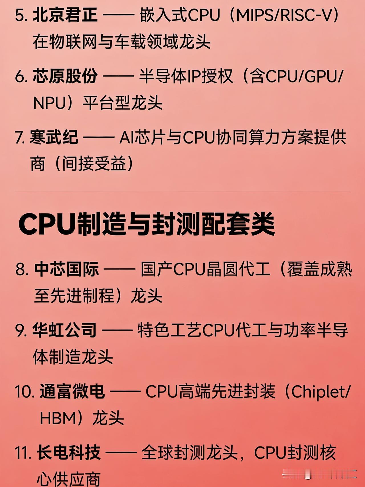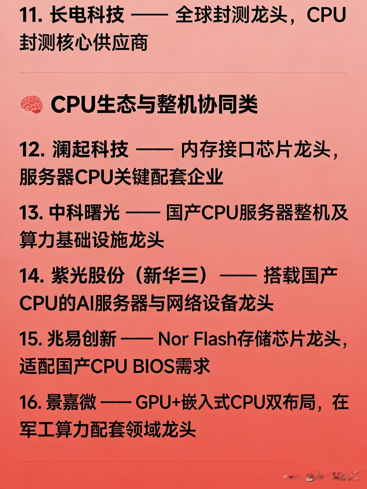 CPU概念相关企业的全汇总 CPU核心设计与IP类 龙芯中科 —— 自主指令集(LoongArch)通用CPU设计龙头 海光信息 —— x86架构服务器CPU及DCU算力芯片龙头 中国长城(飞腾) —— ARM架构国产CPU(飞腾系列)在信创与军工领域龙头 国芯科技 —— 嵌入式CPU IP核及汽车电子CPU龙头 北京君正 —— 嵌入式CPU(MIPS/RISC-V)在物联网与车载领域龙头 芯原股份 —— 半导体IP授权(含CPU/GPU/NPU)平台型龙头 寒武纪 —— AI芯片与CPU协同算力方案提供商(间接受益) CPU制造与封测配套类 中芯国际 —— 国产CPU晶圆代工(覆盖成熟至先进制程)龙头 华虹公司 —— 特色工艺CPU代工与功率半导体制造龙头 通富微电 —— CPU高端先进封装(Chiplet/HBM)龙头 长电科技 —— 全球封测龙头,CPU封测核心供应商 CPU生态与整机协同类 澜起科技 —— 内存接口芯片龙头,服务器CPU关键配套企业 中科曙光 —— 国产CPU服务器整机及算力基础设施龙头 紫光股份(新华三) —— 搭载国产CPU的AI服务器与网络设备龙头 兆易创新 —— Nor Flash存储芯片龙头,适配国产CPU BIOS需求 景嘉微 —— GPU+嵌入式CPU双布局,在军工算力配套领域龙头