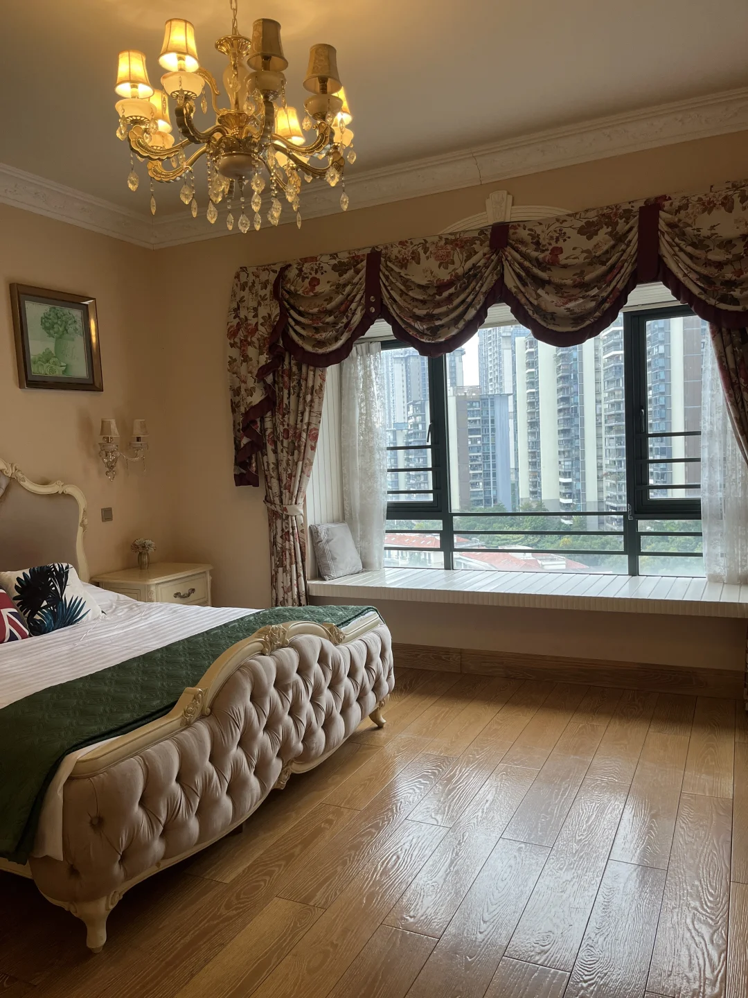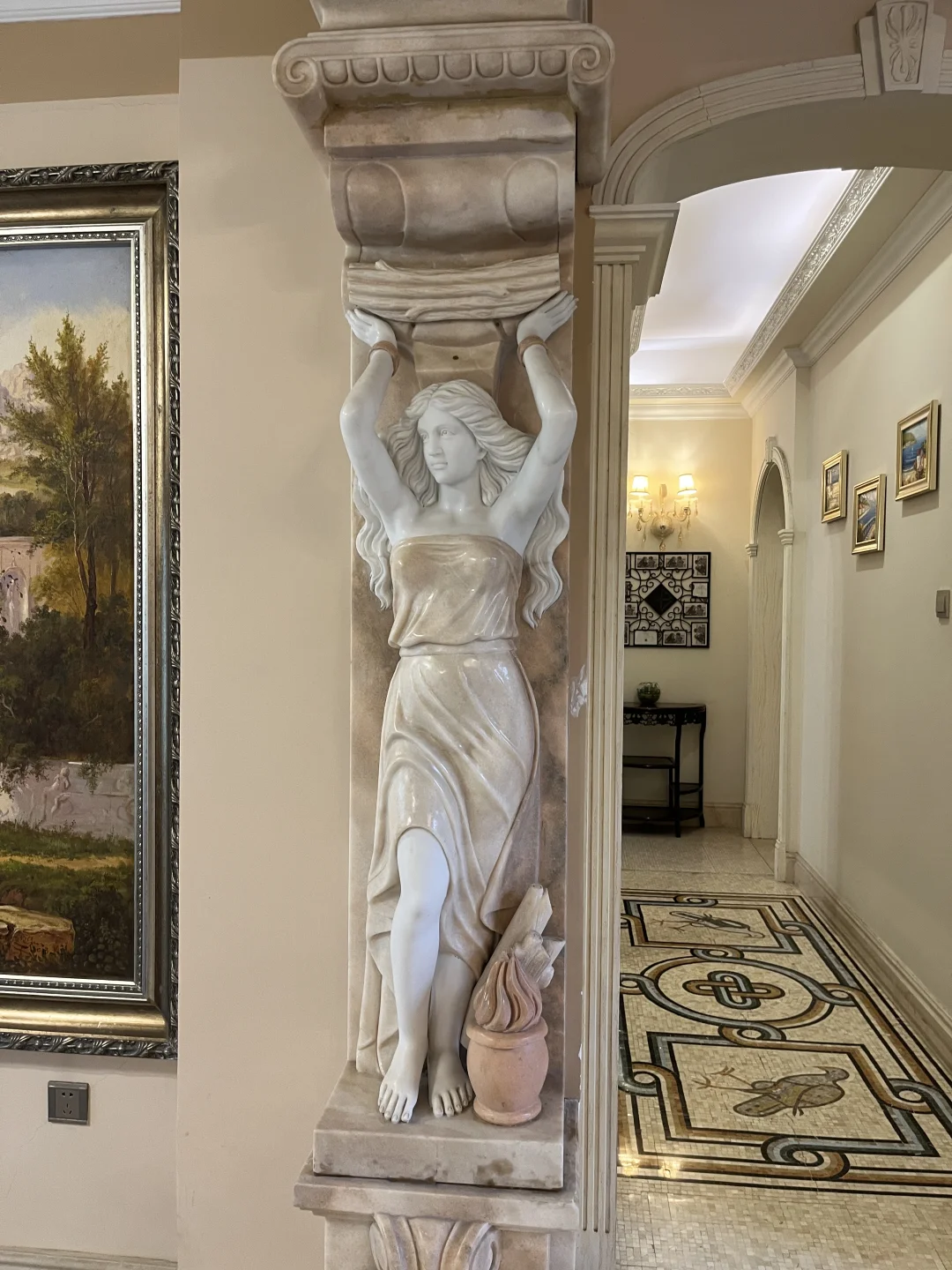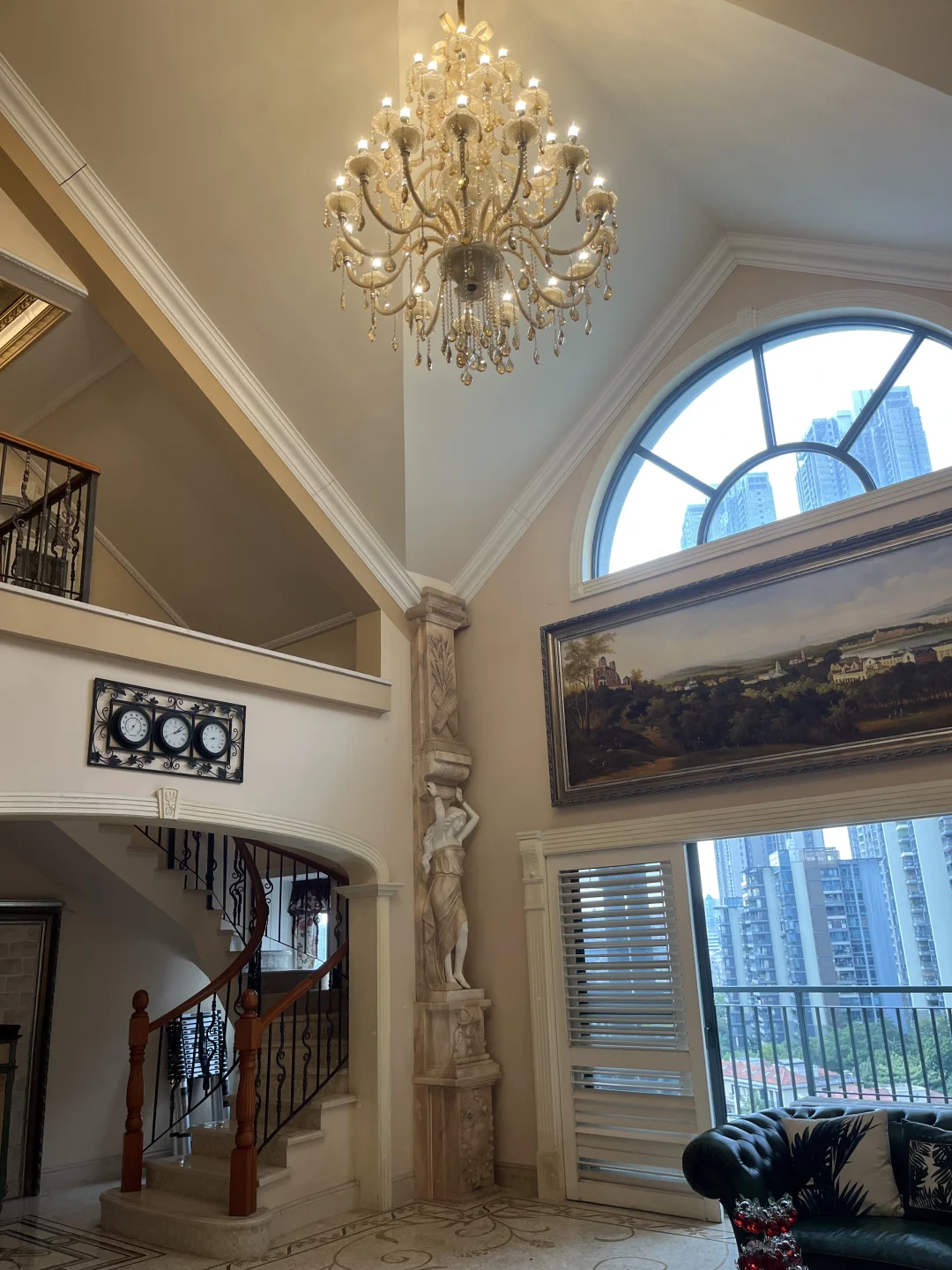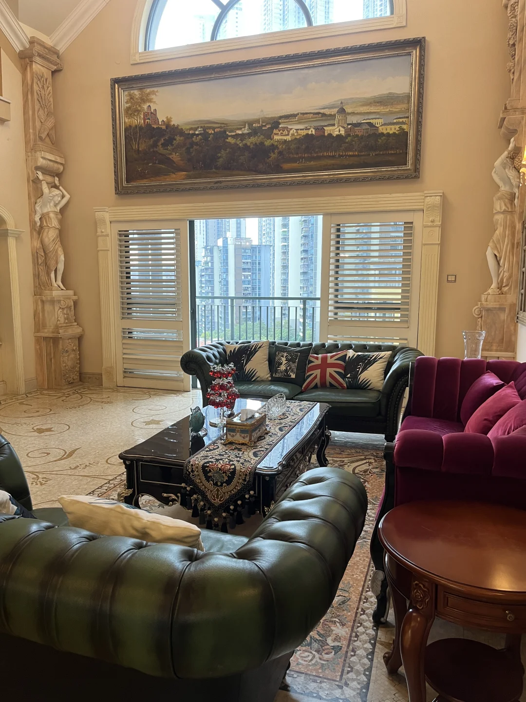 客厅,餐厅,墙上有很多油画,还有天花顶上也超大型的油画,充满了艺术的气息,有想要租这样房子的朋友可以来参观!