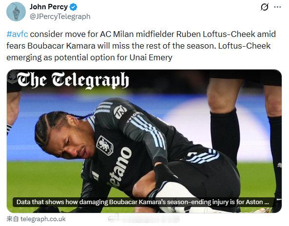 【维拉考虑引进奇克】《电讯报》John Percy消息:阿斯顿维拉主力后腰布巴卡-卡马拉,膝伤赛季报销,俱乐部马上展开引援行动,他们正在考虑从AC米兰引进前切尔西中场洛夫图斯-奇克。