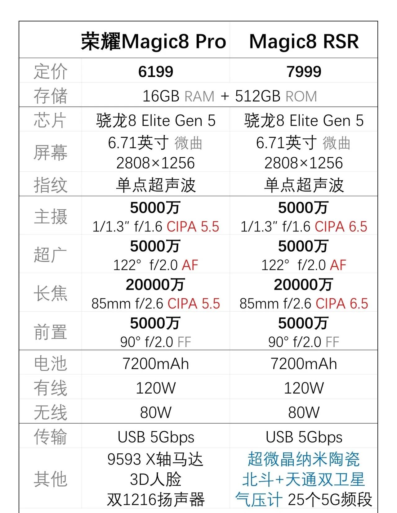 荣耀 Magic8 RSR保时捷设计与 Pro 版差距甚微:由于受到内存涨价,出于成本考量,没采用上代金刚巨犀玻璃,差异在于外观——背面升级为超微晶纳米陶瓷,并新增北斗+天通双卫星通信。影像系统防抖是目前行业TO1。 两者之间,我选择荣耀Magic8 Pro,这个出于预算有限[黑线]