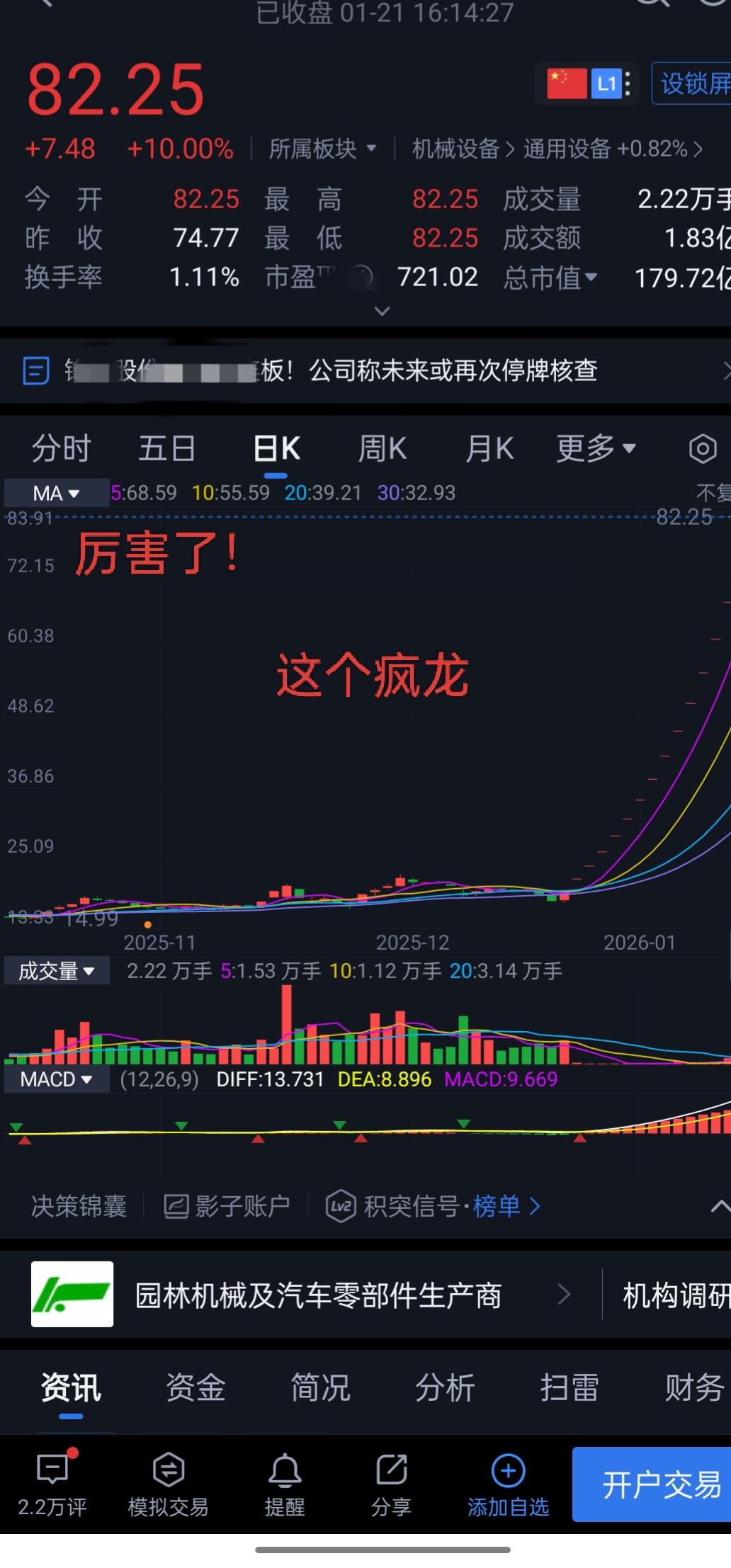涨停狂欢!这个疯龙连续16板引爆市场,为何监管“网开一面”? 当商业航天、AI应用接连回调,市场一片叹息时,疯龙却走出独立行情,连续16个涨停板强势吸睛!除首板为复牌前涨停外,后续15个竟全是一字板,股价已突破82元,创下历史新高,累计涨幅超10倍。 更令市场热议的是,每日超19亿资金排队封板,23万手封单纹丝不动,投资者抢筹热情近乎疯狂。但与此形成鲜明对比的是,近期多只连板股频频被“关小黑屋”停牌核查,它却一路绿灯,未收监管重点提示,引发诸多疑问。 有投资者直呼:“别人的票涨一个板就异动,它16个板却安然无恙?”尽管后续也有异动公告及短暂停牌,但复牌后涨势依旧,这背后是否隐藏不同监管考量?市场情绪与规则执行之间,界限究竟如何把握? 这场涨停盛宴,是价值发现还是情绪博弈?监管的“区别对待”又释放何种信号?或许,在狂热追板之余,每个投资者都该多一分冷静。