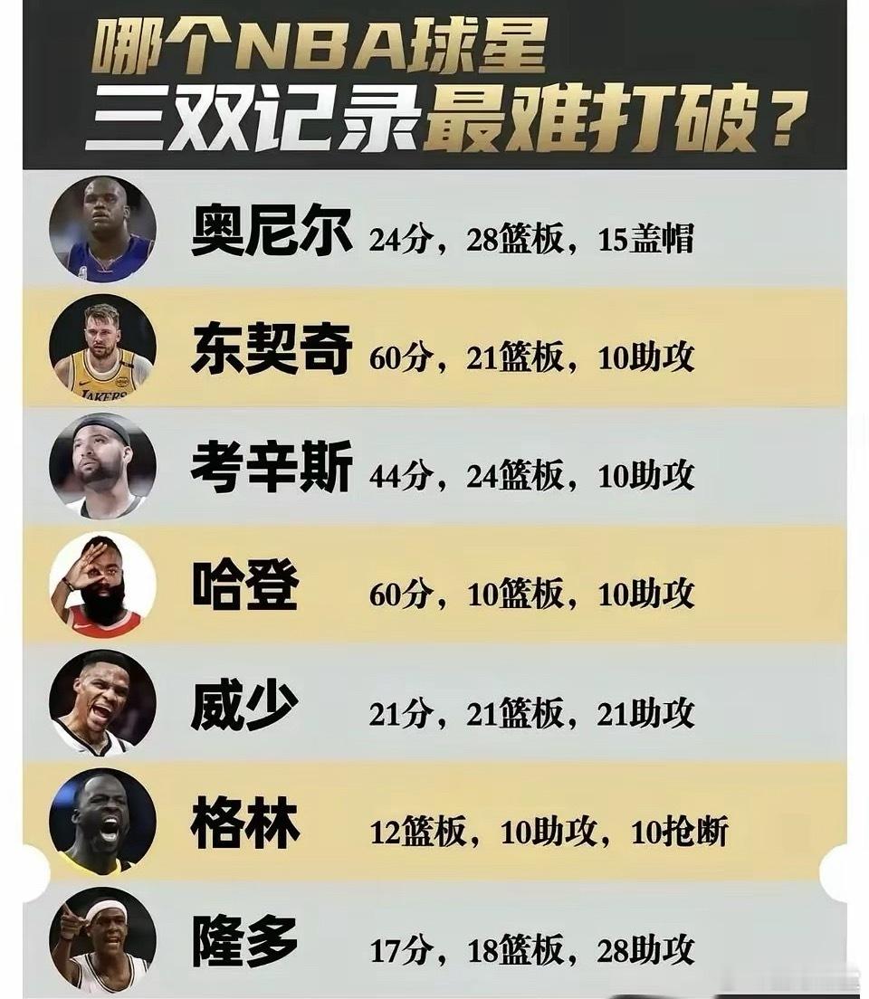 谁的三双记录最难打破? 奥尼尔24分,28篮板,15盖帽东契奇60分,21篮板,10助攻考辛斯44分,24篮板,10助攻哈登60分,10篮板,10助攻威少21分,21篮板,21助攻格林12篮板,10助攻,10抢断隆多17分,18篮板,28助攻