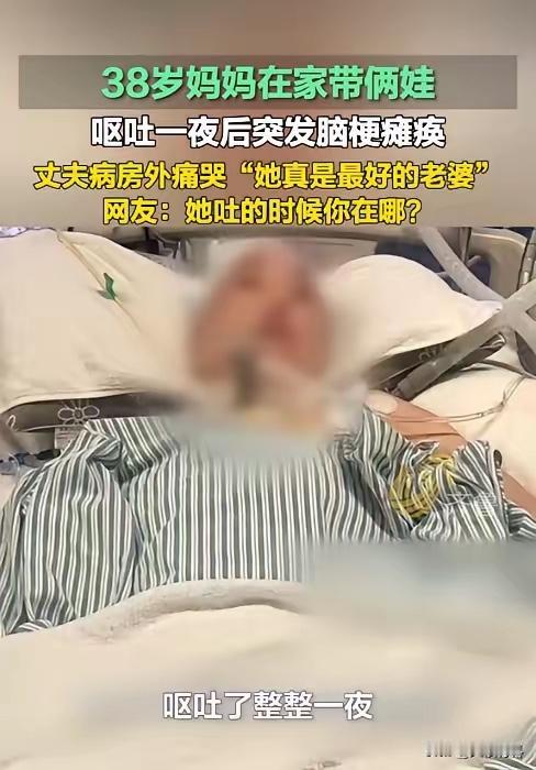 “太痛心了!”据媒体1月15日报道,河南洛阳,一名38岁全职妈妈在家带俩娃时,突然开始频繁呕吐,以为是“累的”便没在意,不料第二天竟突发脑梗瘫痪至今未脱离重症监护!丈夫得知崩溃大哭,后悔结婚19年,没带她出过一次远门,网友:别把陪伴和健康都留给“以后”!   事发前几天,这位妈妈就频繁感到头晕乏力,可既心疼医药费不愿去检查,又担心自己倒下后两个孩子无人照料,只能强撑着打理家务、照顾孩子。   出事当晚,她上吐下泻折腾了一整夜,还误以为是吃坏了肚子,没放在心上。   直到次日清晨想起身照看孩子,才发现半边身体完全动弹不得,连一句完整的话都说不出来,家人这才慌忙将她送往医院。   经检查,她被确诊为大血管堵塞引发的大面积脑梗。医生都不禁感慨,38岁就患上如此严重的脑梗,在临床上十分罕见。   虽然紧急开颅手术保住了她的性命,但后遗症极为严重,如今她虽神志清醒,却已完全失语,只能靠眼神与外界沟通,至今仍在ICU里与死神博弈,二十多个日夜过去仍未能转入普通病房。   悲剧的根源,是长期过度透支身体的累积。这位妈妈曾有自己的职场,为了家庭和孩子主动辞职,从此扛起了家里所有大小琐事。   丈夫常年在外经商,一年回家没几次,对家务和带娃几乎不闻不问,家里的一切都压在她一个人肩上。   她每天清晨五点半就起床做早饭,送完大宝上学,转头要照顾二宝的吃喝拉撒,中午趁孩子午休赶紧抢着做家务,晚上收拾完残局、辅导完作业,等两个孩子入睡往往已到深夜。   这样高强度连轴转的日子,她默默扛了许久,日均睡眠不足六小时,吃饭也常常是匆匆扒几口孩子剩下的饭菜。   长期的睡眠不足、饮食不规律、精神高压,一点点侵蚀着她的身体,最终酿成了无法挽回的后果。   直到此刻,丈夫高先生才彻底醒悟,却早已悔之晚矣。   他把生意全权托付给合伙人,二十多天寸步不离守在ICU门外,死死盯着病房门期盼奇迹。   他录下两个孩子呼唤妈妈的声音,每天隔着门播放,哪怕医生说这只是辅助手段,也不愿放弃一丝希望。   面对镜头,他满是懊悔地说,结婚19年,从没带妻子走出过洛阳,她甚至没离开过河南省。今   年春节本约定好全家去西安游玩,妻子当时还满心欢喜答应,可这个简单的愿望,如今却成了终身遗憾。   小儿子怯生生问他“妈妈是不是不要我了”,这句话像刀子一样扎进他心里,让他心如刀绞却无从解释。   这起事件也打破了很多人的固有认知——脑梗从不是老年人的专利,年轻人长期积劳成疾、压力过载,同样可能诱发。   国家卫健委数据显示,脑卒中已成为我国居民首位死因,且年轻化趋势明显,二三十岁的患者在医院并不少见。   牢记BEFAST原则能在关键时刻救命,观察面部是否对称、手臂是否单侧无力、吐字是否清晰,一旦出现异常要立即拨打120,脑梗的黄金救治窗口期仅3至4.5小时。   可现实中,不少女性像这位妈妈一样,把身体的求救信号当成“累的”,硬生生错过了最佳治疗时机。   全职妈妈这个群体,往往容易被社会和家庭忽视。全国妇联调查显示,我国女性日均无偿劳动时长是男性的2倍,全职妈妈每日照料孩子近6小时,还需承担绝大部分家务。   世界卫生组织数据也表明,全球每3名抑郁症患者中就有2名是女性,全职妈妈心理亚健康比例高达58%,长期焦虑与高压都是损伤血管的隐形杀手。   网友们纷纷共情,有人心疼她的付出,有人指责丈夫的疏忽,更有人点出全职妈妈健康易被忽视的真相。   家庭的重担从来不该由一个人承担,丈夫不能当甩手掌柜,理应主动分担带娃和家务,给妻子喘息的空间。   身体的不适更不能硬扛,及时就医排查才是对自己和家人负责。别让被搁置的陪伴、被忽视的健康,最终变成无法弥补的遗憾。