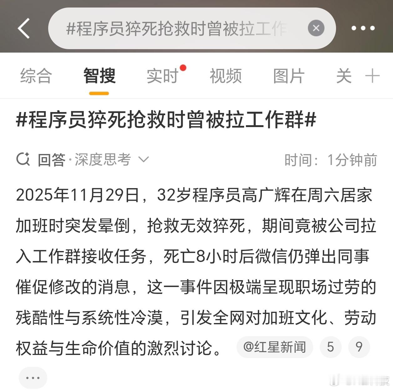 2026年了还能看到这种事发生…也是挺让人痛心的,工作不是生活的全部,真没必要那么拼,人在职场最重要的是把握工作节奏,该紧的时候紧,该松的时候松,不要逼自己。如果工作压迫感十分重,就赶紧辞职换份新工作,大家记得都对自己好点程序员猝死抢救时曾被拉工作群