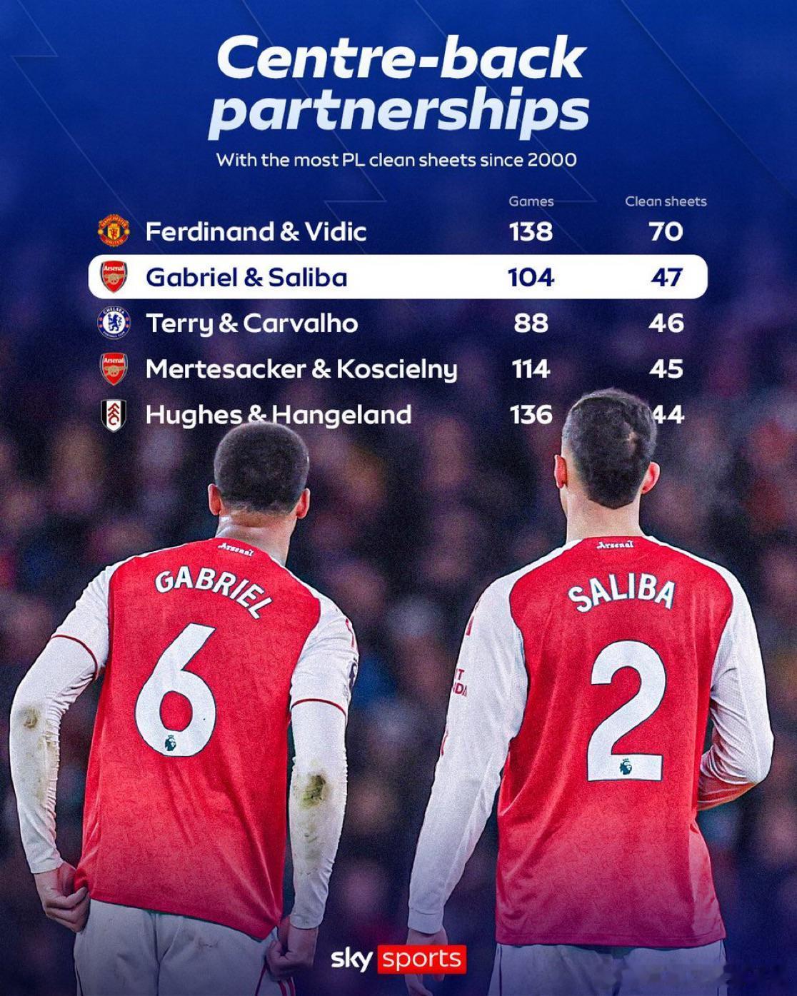 天空体育统计英超自2000年以来,零封场次最多的中卫搭档🧱🥇 费迪南德 & 维迪奇(曼联)— 138场 / 70次零封🥈 加布里埃尔 & 萨利巴(阿森纳)— 104场 / 47次零封🥉 特里 & 卡瓦略(切尔西)— 88场 / 46次零封4️⃣ 默特萨克 & 科斯切尔尼(阿森纳)— 114场 / 45次零封5️⃣ 休斯 & 汉格兰(富勒姆)— 136场 / 44次零封