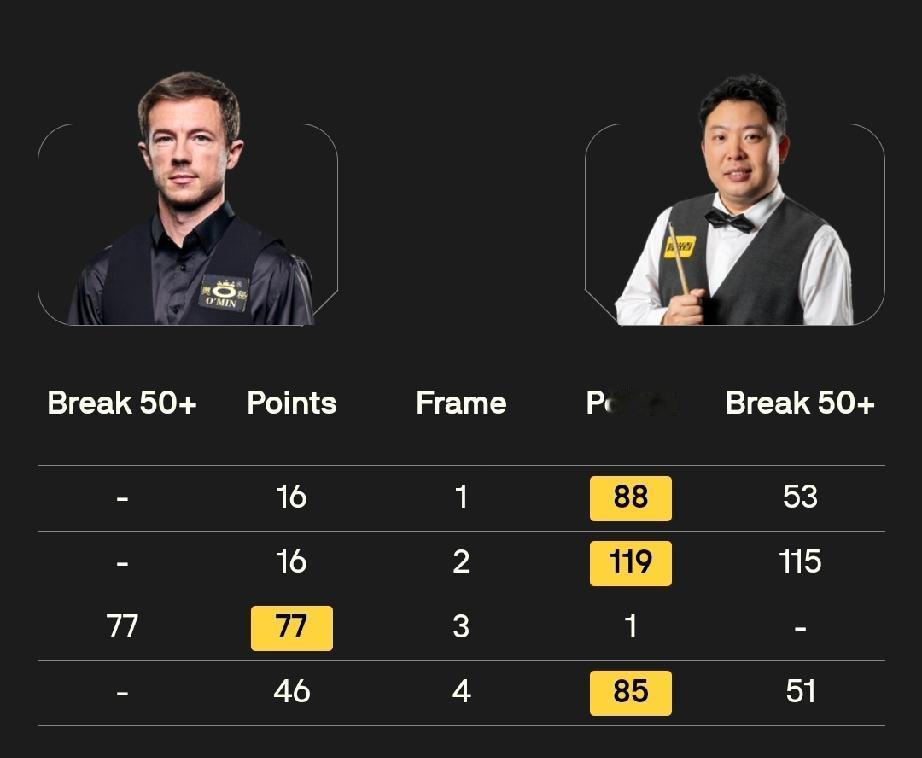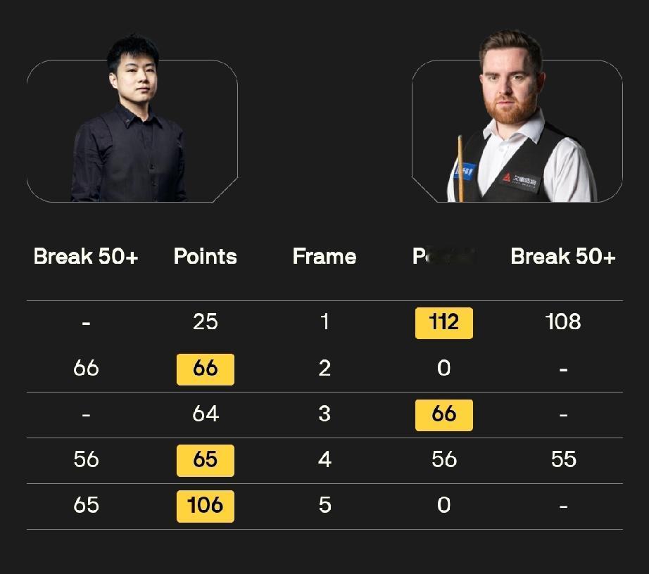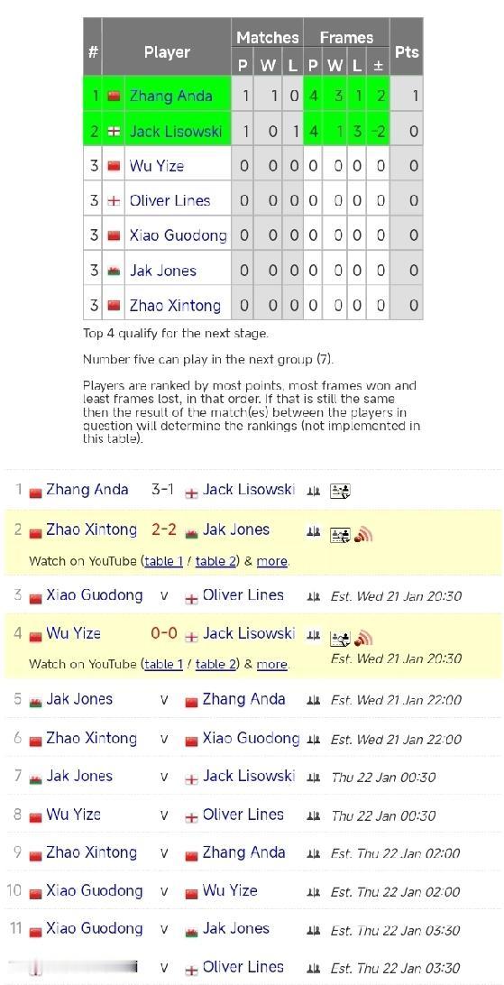 赵心童 3-2 杰克·琼斯 张安达 3-1 杰克·利索夫斯基 1月21日19点,斯诺克冠军联赛第六小组比赛拉开帷幕。 揭幕战,张安达打出一杆破百两杆50+,3-1击败杰克·利索夫斯基;赵心童打出三杆50+,3-2击败杰克·琼斯。 20:30,吴宜泽对阵杰克·利索夫斯基、肖国栋对阵奥利弗·莱恩斯。