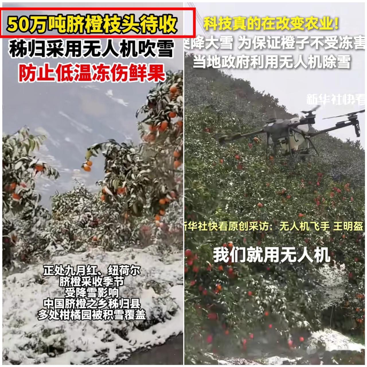 科技护橙! 秭归50万吨脐橙待收,无人机吹雪防冻伤,果农心里踏实了! 寒潮暴雪突袭,秭归“中国脐橙之乡”告急! 九月红、纽荷尔正挂枝待采,积雪压枝+低温冻伤,直接威胁果农一年收成。 关键时刻,无人机编队上阵! 螺旋桨强风一吹,树冠积雪秒落,不伤果、不伤枝,效率比人工高几倍,一天就能护住几十亩橙园。 果农说:“听到无人机响,心就稳了!” 从靠天吃饭到科技护航,这才是现代农业的底气! 保住鲜果,就是守住果农的钱袋子,为硬核护橙点赞 你吃过秭归脐橙吗? 觉得科技助农香不香? 评论区聊聊~
