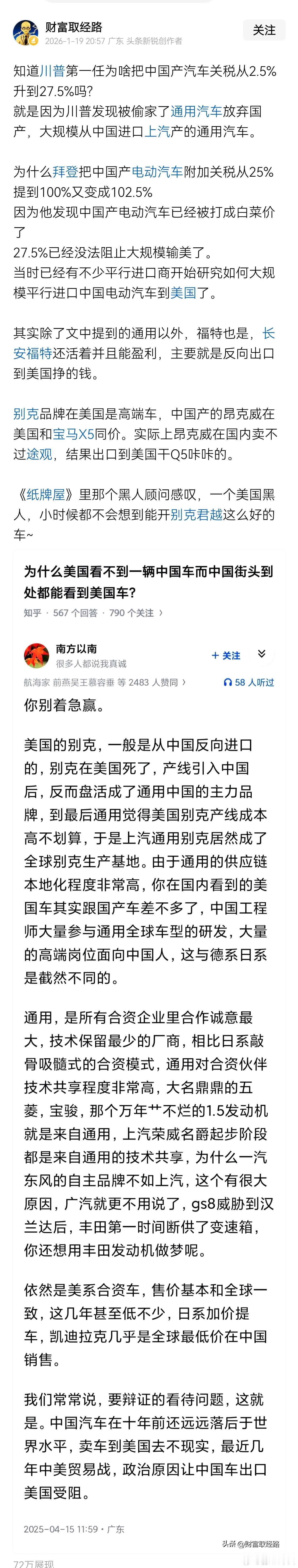 知道特朗普第一任为啥把中国产汽车关税从2.5%升到27.5%吗?就是因为特朗普发现被偷家了通用汽车放弃国产,大规模从中国进口上汽产的通用汽车。为什么拜登把中国产电动汽车附加关税从25%提到100%又变成102.5%因为他发现中国产电动汽车已经被打成白菜价了,27.5%已经没法阻止大规模输美了。总体上就是竞争不过开始掀桌子,不遵守WTO协议了。