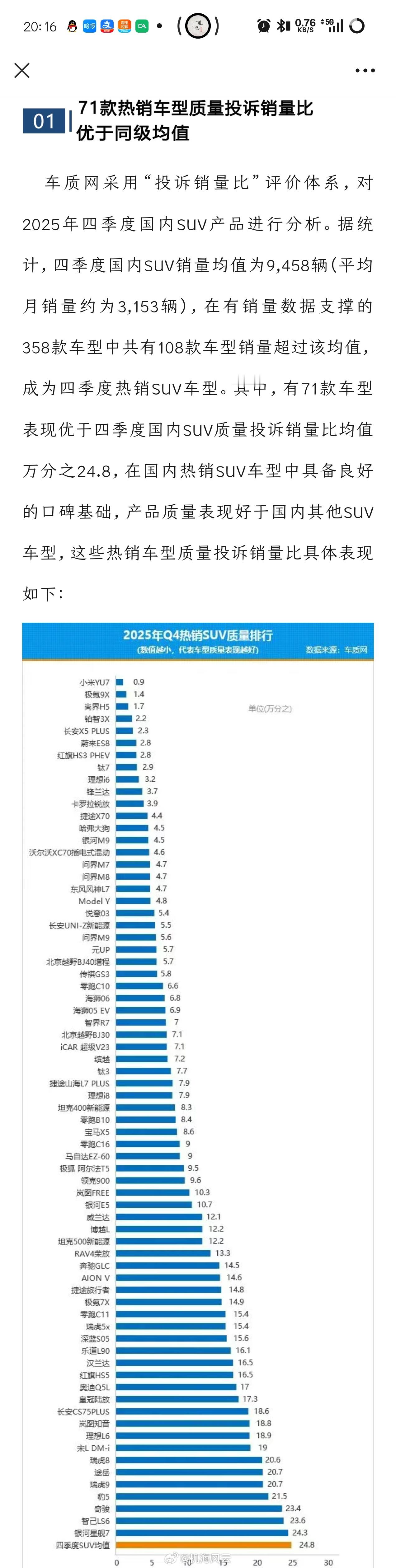 小米YU7获得SUV质量排名第一之前好像听雷军在直播间提到过不止一嘴,大意大抵就是但凡是小米发布的重磅产品,必然会享受全网放大镜🔍般寻找“瑕疵”的礼遇,这对很多品牌来讲,都是很崩溃的事,但长期下来,我发现它可能反而是好事。因为有一个“效果”已经立竿见影,就是这个品牌的大部头产品,在最基础的质量一环,必然是经受过千锤百炼的,尤其是大几十万的车,你说对消费者而言,这种“百万严选”过的产品,还有啥不放心的?不过我还想帮雷总他们“纠正”一点,小米汽车并不是因为怕黑才做到质量拔尖,而是从立项之初就以极苛刻的标准来执行的(前几天拆车直播更是水灵灵的标杆级示范,对品质和用料没底气的,这么玩谁敢?),数据不会说谎,你们品品这万分之0.9投诉销量比的含金量!传奇耐hei王实至名归?