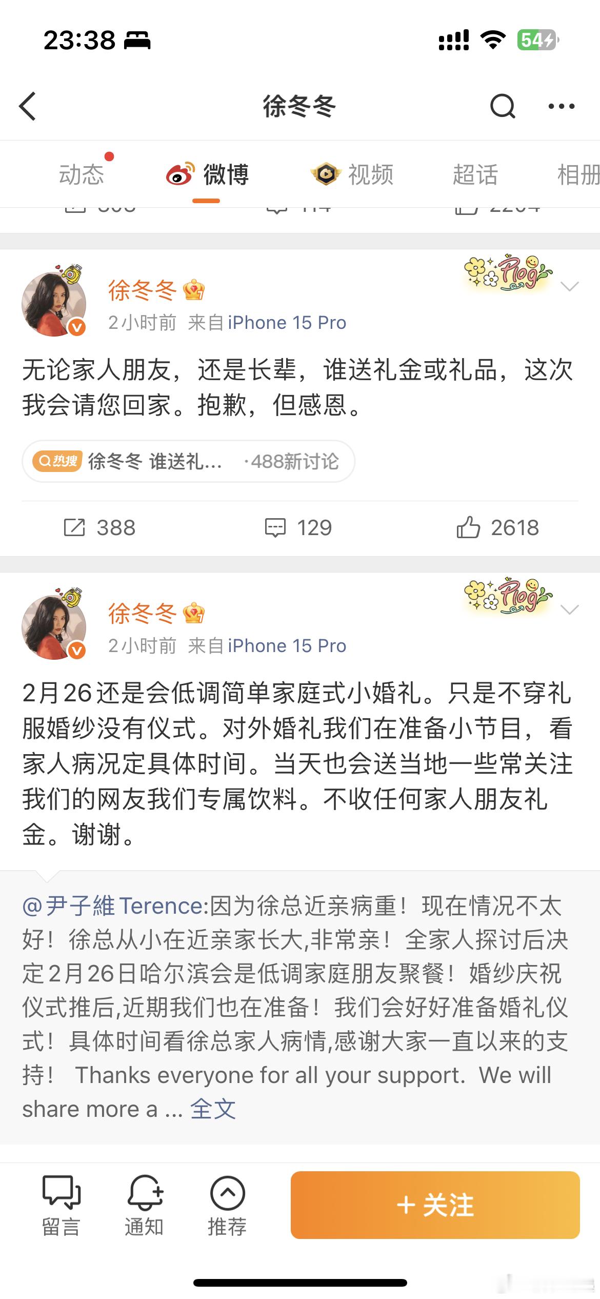 徐冬冬 谁送礼就请谁回家婚礼在即,家人病重,徐冬冬果断决定简化仪式,更发出霸总式宣告:无论亲友长辈,但凡送礼金礼品,会被直接“请回家”!她坚称,婚礼的真谛在于真诚祝福而非物质。这波绝不收礼的强硬表态,赢得了无数网友点赞,称其为“人间清醒的纯爱战士”。