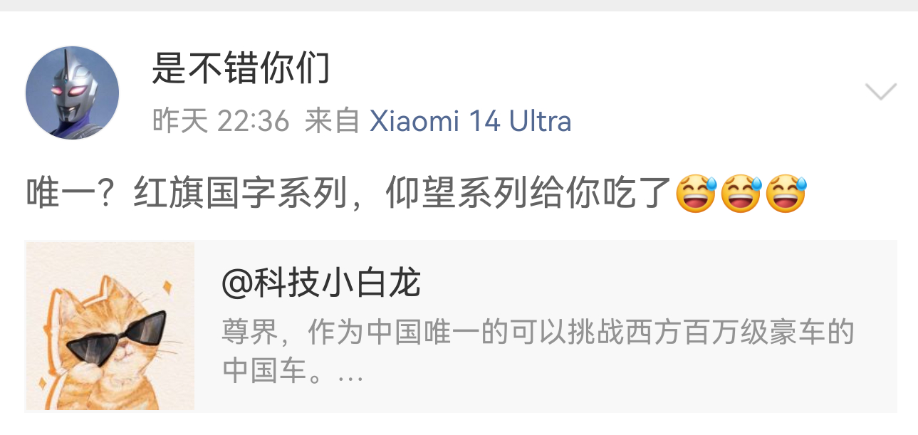 这些人可能不明白我在说什么,以前我们把国雅仰望吹的再好,掏钱的人买迈巴赫、帕拉梅拉。现在,我们把迈巴赫、帕拉梅拉吹的再好,掏钱的人买尊界。所以目前,尊界是唯一,有问题?其他的国产也很好,但真正在市场上打败西方那些豪车的,只有尊界。