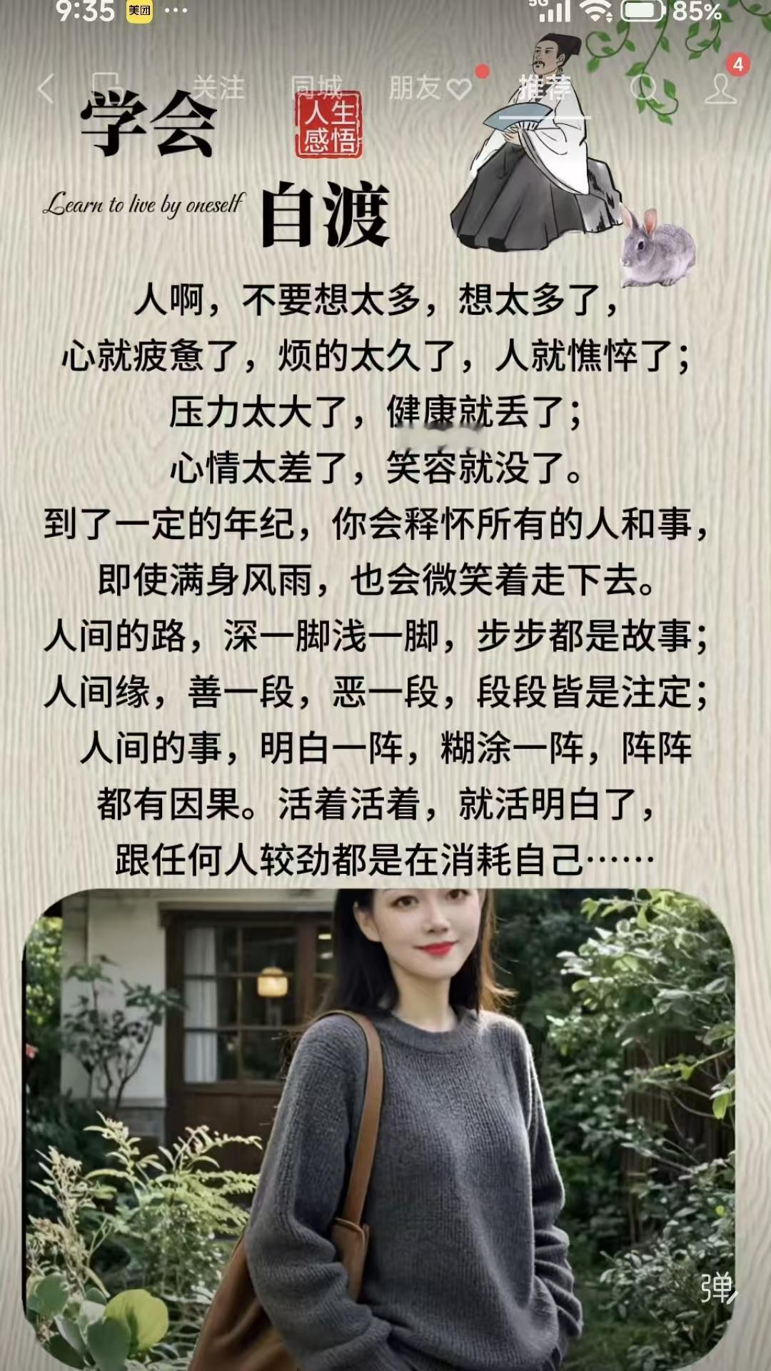塞鸿秋·学会自渡 休教思绪心头绕, 想多心倦人憔槁。 烦忧久聚身难好, 压力频添欢颜少。 年高诸事抛, 风雨仍含笑。 尘途缘法皆前道, 莫同他较身心耗。