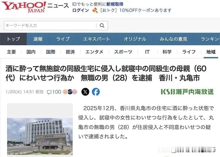 很日本!日本28岁男子醉酒后猥亵同学60岁妈妈而被逮捕! 据日本媒体报道,一名28岁男子因涉嫌入侵住宅和未经同意的猥亵被逮捕! 据报道,该男子于2025年12月非法闯入一户民宅,并在一名女子熟睡时对其进行猥亵行为。据警方称,该男子涉嫌于12月23日凌晨2点左右,在醉酒状态下闯入一名同学位于丸龟市的家中,趁对方熟睡时对同学60多岁的母亲进行猥亵。 在警方审讯中,该男子承认了指控!