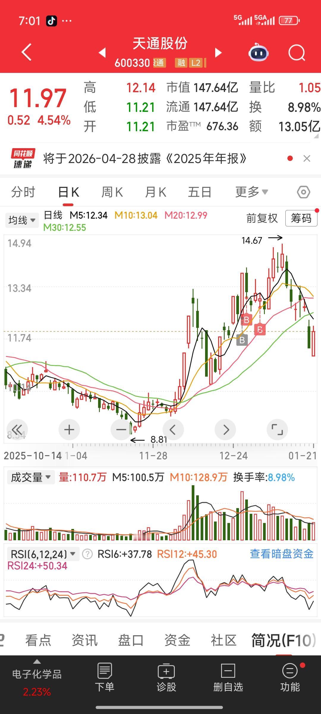 前天,天通股份在商业航天航空板块调整下跌的过程中,突然公布预亏的年报业绩。这一消息公布后,当天该股跌停收盘,且成交量放大。 昨天,天通股份适当低开,随后强势拉红,收复了一半的失地。这是因为利空出尽,股价止跌了吗?那前天是借利空彻底洗盘干净了吗? 实际上,天通股份拥有众多正宗概念,其概念逻辑底层十分坚实,涵盖正宗的商业航天材料概念、人形机器人概念、人工智能概念,还有CPO、光伏储能等一系列热门概念。 所以,我认为长期持有这只股票无需担忧,可继续持有观望。有机会就做个T,没机会就持有3 - 5个月。天通股份在商业航天航空板块上涨时并未跟涨,或许该股主力炒作的并非商业航天航空概念,而是在等待其他利好消息,比如年报扭亏。2026年它是否会实现扭亏呢? 航天发展股票 航空航天概念股 航空航天股 商业航天低价股 航天航空股票 航天航空概念股 天普股份