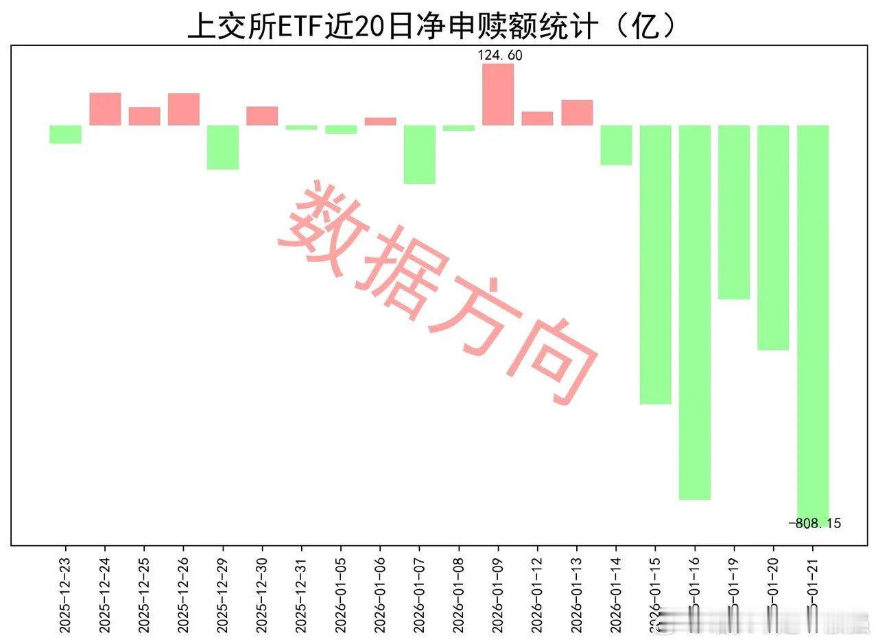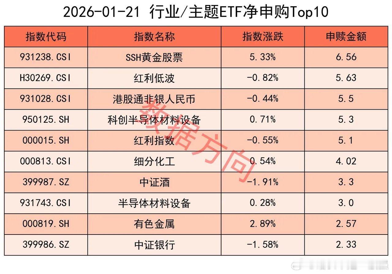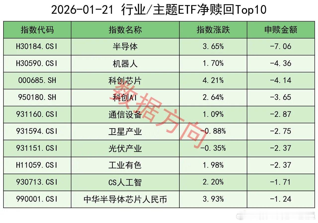 某队态度坚定,再出重手!1月21日星期三,大盘震荡整理,贵金属、半导体涨幅居前。上证指数涨幅0.08%,上交所iconETF合计净赎回icon808.15亿元!大盘上午一度继续冲高,午后14:30分,一股神秘力量喷薄而出,多只宽指ETF同时大幅放量下跌,市场纷纷猜测1层又出手了。果然,全天净赎回808.15亿,这不仅是连续第5天大幅净赎回,而且打破了上周五刚创下的单日净赎回金额最高纪录。前面四天的净赎回金额分别为560.72亿、753.26亿、349.37亿、452.32亿,五天下来,累计净赎回2923亿。这还仅仅只是上交所的净赎回金额,如果把深交所icon的算进来,估计能够超过4000亿!这是一个非常惊人的数据,大盘强是事实,但1层的态度异常坚定。宽指中证icon500指数(4.17亿)、中证A50指数(0.21亿)、上证180指数(0.06亿),分别获得小幅净申购。沪深300指数(-448.93亿),净赎回超过400亿。中证1000指数(-197.88亿)、上证50指数(-132.28亿),净赎回均超过130亿。科创50指数(-57.26亿),净赎回超过50亿。昨天有传言1层把手里的科创50卖完了所以大涨,从复盘情况来看,还在卖。中证A500指数(-8.2亿)、科创创业50指数(-0.74亿)、科创100指数(-0.33亿)、上证指数(-0.03亿),净赎回都在10亿以内。行业和主题 SSH黄金股票指数(6.56亿)、细分化工指数(4.02亿)、有色金属指数(2.57亿),一起进入申购icon榜;工业有色指数(-2.37亿),进入赎回榜。红利低波指数(5.63亿)、红利指数(5.1亿)、中证银行指数(2.33亿),一起进入申购榜。科创半导体材料设备指数(5.3亿)、半导体材料设备指数(3.0亿),一起进入申购榜;半导体指数(-7.06亿)、科创芯片指数(-4.14亿)、中华半导体芯片icon人民币指数(-1.24亿,一起进入赎回榜。其他进入申购榜的还有:港股通icon非银人民币指数(5.5亿)、中证酒指数(3.3亿)。科创AI指数(-3.65亿)、CS人工智指数(-1.71亿),一起进入赎回榜。其他进入赎回榜的还有:机器人指数(-4.36亿)、通信设备指数(-2.87亿)、卫星产业指数(-2.75亿)、光伏产业icon指数(-2.37亿)。ETF