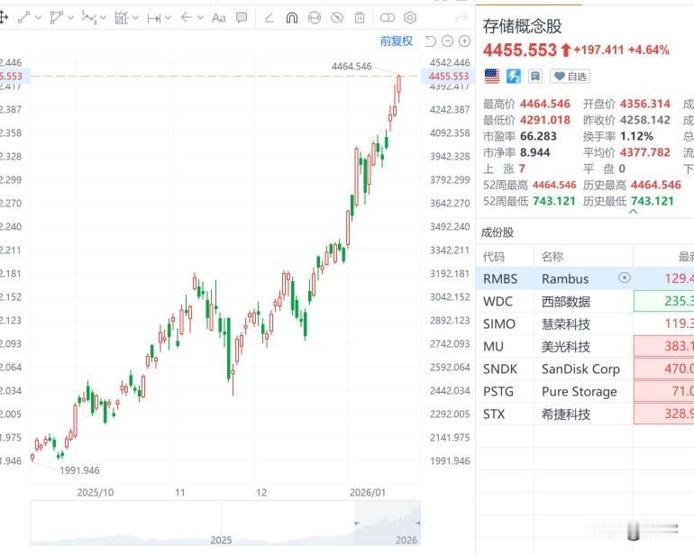 中美存储芯片概念股连续创出新高。 这两张图是美股与A股“存储芯片概念”的走势情