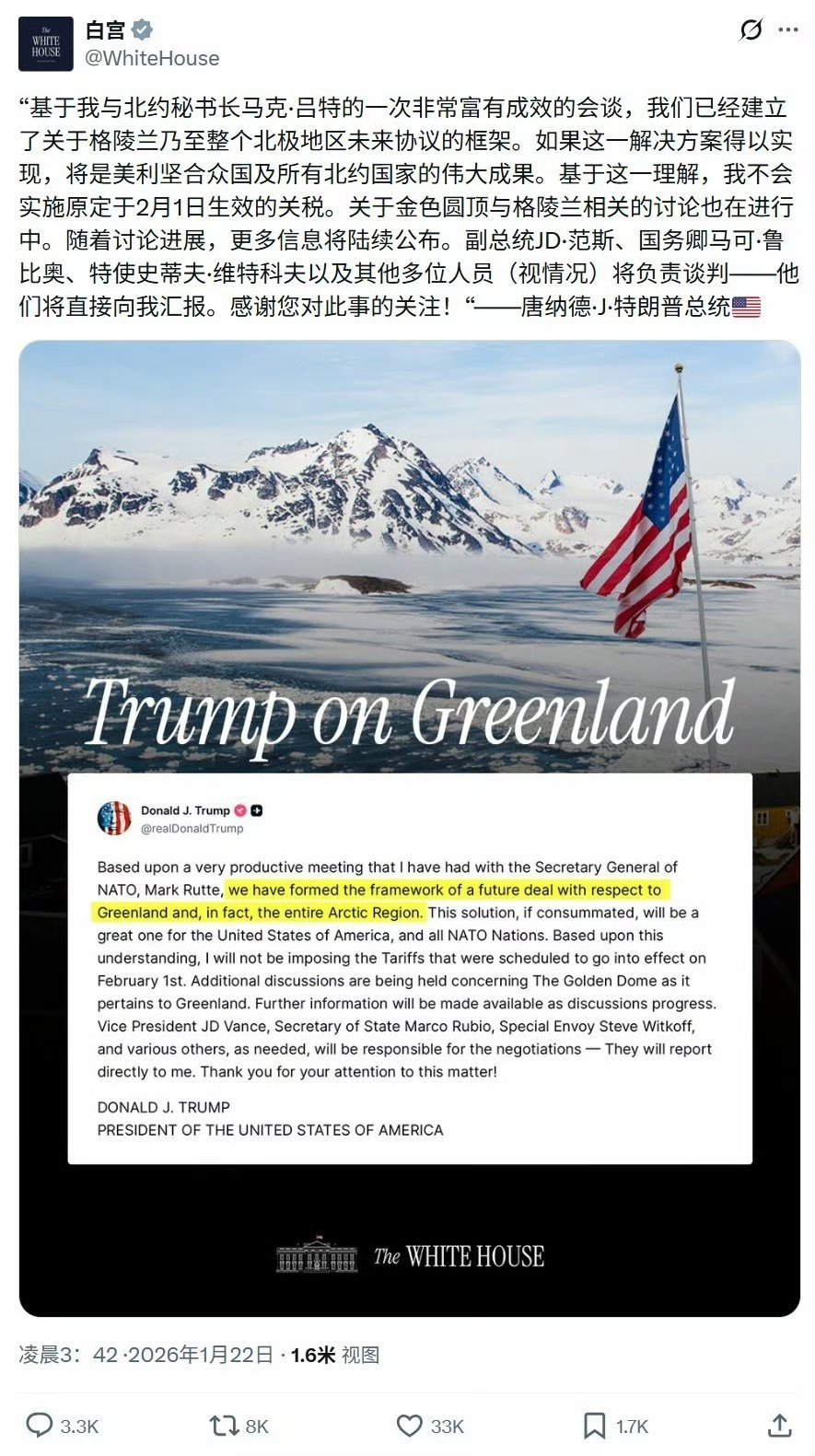 特朗普发文称就格陵兰岛及北极问题与北约国家达成协议框架“基于我与北约秘书长马克·吕特的一次非常富有成效的会谈,我们已经建立了关于格陵兰乃至整个北极地区未来协议的框架。如果这一解决方案得以实现,将是美利坚合众国及所有北约国家的伟大成果……”海外新鲜事烽火问鼎计划
