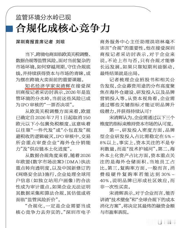 监管环境分水岭已现,合规化成核心竞争力。据深圳商报,当下,跨境电商面临欧美关税调整、数据合规等监管风险。面对当前复杂的市场环境,如何穿越周期,守住合规底线,并持续获得资本与市场的青睐,成为摆在跨境大卖面前的重要课题。 知名经济学家宋清辉在接受深圳商报记者采访时表示,2026年是监管环境的分水岭,当前这些风险已成为IPO审核的“一票否决项”。 从欧美关税调整方面来看,欧盟已确定自2026年7月1日起取消150欧元以下小包裹免税额度。这意味着以往靠“一件代发”或“小包直发”规避税收的逻辑破灭。IPO审核中,交易所会重点审查企业“海外仓分销能力”及“供应链本土化进度”。 从数据合规角度来看,随着2026年欧盟《数字市场法案》(DMA)执法重点转向透明度,以及中国新修订的《网络安全法》施行,企业处理全球用户信息(如独立站用户画像)的合法性成为审计重点。如果企业无法证明其数据采集和算法合规,其估值或将面临“监管风险折价”。