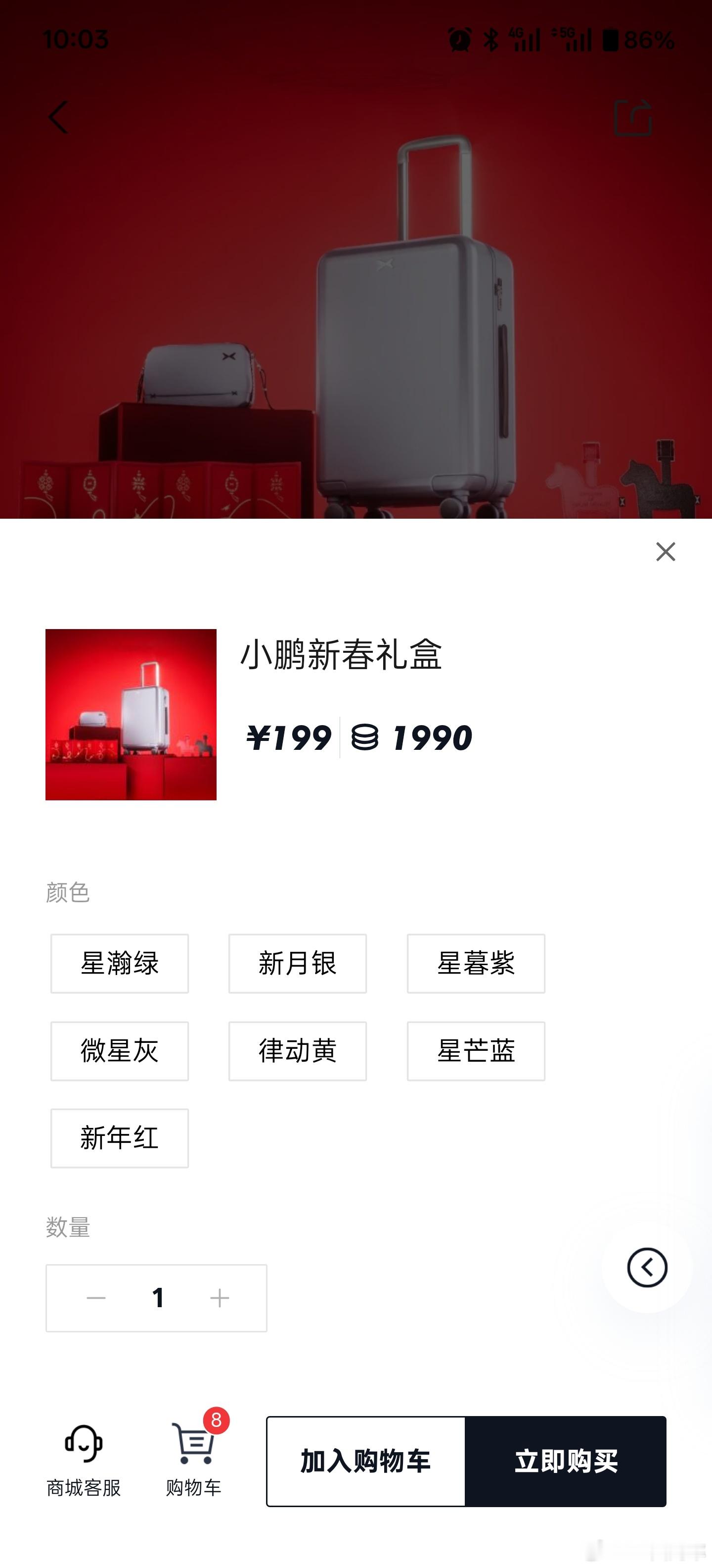 鹏厂新春礼盒上架商城了!有1个18寸的行李箱+1个洗漱袋+1个小马pu挂件+6个红包。这个行李箱还是PC材质的,有手机支架、充电接口、杯架和锁,适合短途出行。最重要的可以全额积分抵扣!先冲了,到货了分享!需要的尽快下单,一般是2-3天就卖光了小鹏汽车