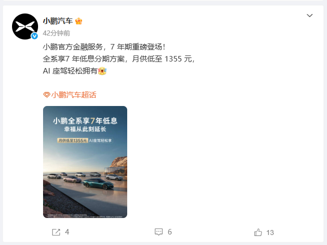 小鹏也跟进特斯拉和理想的全系享7 年低息分期方案,月供低至 1355 元。一般大家买车是在大学毕业工作两年后,也就是25岁左右买车居多,那你7年后32岁才还完车贷,等你换下一辆车的时候,基本就是生孩子换SUV的时候了。大家会贷款七年买车吗?
