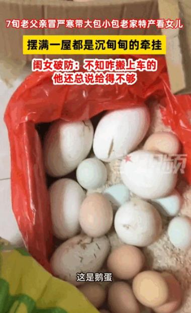 泪目了!河南郑州,近日,一位75岁老父亲在零下10度的天气,竟然从农村坐大巴250多公里给女儿送土产。女儿原以为只是爸爸种青菜,没想到除了肉和鸡等之外,还有200个土鸡蛋,让女儿瞬间热泪盈眶! 那天清晨,郑州的天冷得厉害,寒风像刀子一样刮在脸上,最低气温已经到了零下10度。毛女士正准备上班,手机忽然响了,是父亲打来的电话。 电话那头,老父亲的声音一如既往地朴实:“闺女,我到郑州了,你下楼来接我一下吧。” 毛女士一愣。她父亲今年75岁,常年住在农村,腿脚不算利索,平时连县城都很少去,更别说独自跑到郑州来。 她一边埋怨,一边披上外套往楼下跑,心里还想着:估计又是给我送点自家种的青菜吧,这么冷的天,真是折腾人。 可当她看到父亲的那一刻,所有责怪的话一下子堵在了喉咙里。 老父亲站在小区门口,裹着一件洗得发白的旧棉袄,肩上背着一个鼓鼓囊囊的大编织袋,脚边还放着两个沉甸甸的蛇皮袋。 脸被寒风吹得通红,手冻得发紫,却依旧笑呵呵地看着女儿,像个完成任务的孩子。 “你这是拿了多少东西啊?”毛女士一边说,一边伸手去提袋子,结果差点没提动。 回到家,把袋子一一打开,毛女士当场愣住了。 最上面,是一捆用绳子扎得整整齐齐的青菜,叶子还带着霜,一看就是早上刚从地里拔的。 再往下,是一只已经收拾干净的土鸡,还有一块切得方方正正的猪肉,用塑料袋裹了好几层,生怕路上坏了。 可真正让毛女士忍不住掉眼泪的,是袋子最底下的那一层——整整两箱土鸡蛋,数一数,足足有200个。 “爸,你这是干啥啊?我一个人哪吃得了这么多?”毛女士的声音开始发颤。 老父亲搓着冻僵的手,有点不好意思地笑:“你不是说最近工作忙,老熬夜吗?多吃点鸡蛋补补。鸡是家里养的,蛋也是自家鸡下的,放心吃,香得很。” 原来,为了给女儿攒这些鸡蛋,老父亲几乎把家里鸡窝里这段时间下的蛋都留了下来。 怕路上磕坏,他一个个用旧报纸包好,又装进纸箱里,箱子外面再套上蛇皮袋。出发那天,天还没亮,他就从村里坐三轮车到镇上,再转大巴,一路辗转250多公里,坐了将近六个小时。 “车上冷得很吧?”毛女士哽咽着问。 父亲摆摆手:“不冷不冷,车里有暖气。我就怕鸡蛋颠坏了,一路都不敢睡。” 那一刻,毛女士再也忍不住,眼泪啪嗒啪嗒往下掉。她突然意识到,在父亲眼里,距离、寒冷、年纪,从来都不是问题。只要是给女儿的,再苦再累,他都觉得值得。 这段视频被传到网上后,迅速引发了无数网友的共鸣。 有人说:“这些东西有价,但父爱无价。”有人说:“我爸也是这样,每次来城里,恨不得把整个家都搬给我。”还有人看着看着就哭了:“想起我爸了,可他已经不在了。” 其实,很多父亲都是这样,不善言辞,不会说“我爱你”,却把所有的爱都藏进一袋袋土产里,藏进一次次不计辛苦的奔波中。对他们来说,孩子过得好不好,比什么都重要。 也许在我们眼里,这只是几袋菜、几只鸡、一些鸡蛋;可在父亲心里,那是他能给孩子的全部底气和牵挂。寒风再冷,也冷不过一颗惦记孩子的心。
