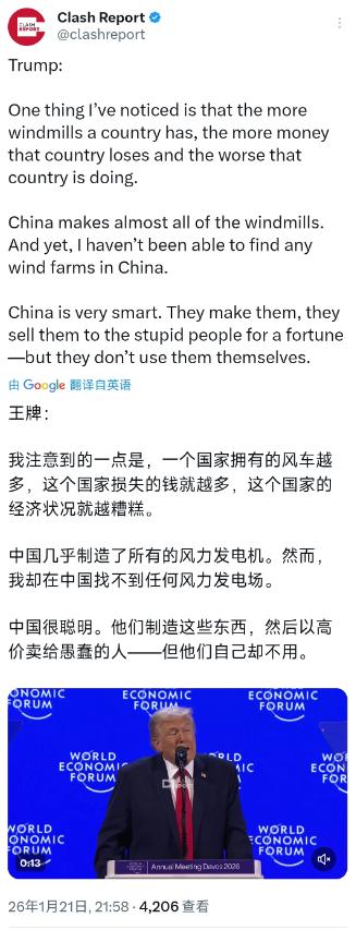 特朗普刚刚在达沃斯论坛上又胡说八道了,特朗普表示:“我注意到的一点是,一个国家拥有的风车越多,这个国家损失的钱就越多,这个国家的经济状况就越糟糕,中国几乎制造了所有的风力发电机,然而,我却在中国找不到任何风力发电场,中国很聪明,他们制造这些东西,然后以高价卖给愚蠢的人但他们自己却不用。”   这番话一出,不少了解风电行业的人都觉得离谱,事实根本不是他说的那样。   先说说特朗普这个人,作为美国现任总统,他向来擅长用极端言论博眼球,对风电产业更是打心底里抵触。   之前他就公开吐槽风车“又大又丑”,还曾下令暂停美国陆上和海上风电项目的联邦许可,没多久又以“国家安全风险”为由,叫停了所有在建的大型海上风电项目,理由竟是叶片运动可能干扰雷达,这在行业内看来就是借口。   这么说吧,特朗普说中国没有风电场,纯粹是睁着眼说瞎话,中国不仅是风电设备制造大国,更是全球最大的风电应用国。   从新疆的戈壁滩到东部的沿海海面,到处都能看到高高矗立的风车,这些风车每年输送的绿电多到惊人。   有数据为证,2024年中国新增风电装机容量占了全球七成左右,累计装机容量超过5.2亿千瓦,差不多是全球总量的一半。   全球每新增3台风机,就有近2台落在中国,去年中国风力发电量快逼近一万亿千瓦时了,相当于不少中小国家全年的用电量总和,这怎么可能是“自己不用”?   说白了,中国风电产业早就形成了完整的产业链,从设备制造到项目建设、技术研发,都走在世界前面。   现在中国造的风机出口到四十多个国家,在海外建了不少风电场,帮当地降低用能成本、解决用电问题,但我们自己的风电应用规模,从来都是全球领先,这是实打实的硬实力。   其实特朗普对风电的抵触不是一天两天了,他叫停美国风电项目后,不仅引发行业不满,还导致相关企业股价暴跌,不少就业岗位受到威胁。   他刻意抹黑中国风电,大概率是想转移视线,掩盖自己政策对美国清洁能源产业的冲击,毕竟在全球能源转型的大趋势下,抵制风电根本不符合经济发展规律。   风电作为清洁能源的重要组成部分,早已不是“赔钱货”,中国风电度电成本比煤电还低三成,既能环保又能保障能源安全。   特朗普的言论,本质上是无视行业发展事实的主观臆断,终究经不起数据和现实的检验。   随着绿色发展理念深入人心,这样的离谱言论,只会沦为国际舞台上的笑谈。