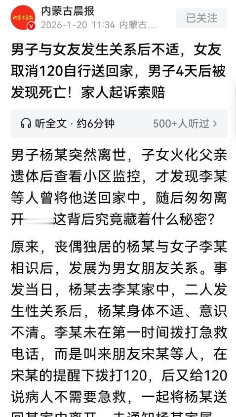 “这就是放纵的后果!”山西太原,一丧偶男子去女子家约会,两人完事后,男子感觉身体不适,随后晕了过去,女子没拨打120,竟然叫来4个朋友,朋友一看男子挺严重,让女子赶紧打120,可女子打完后怕花钱更怕惹麻烦,竟然和4个朋友,一起把男子送回家,4天后,男子的儿女发现他死在家里,火化后,一查小区监控,发现女子见死不救,直接把女子5人告上法庭,索赔31万。   2023年5月7号上午,杨某按约去了李某家,两人发生关系后,杨某突然身体不适,很快就意识不清晕了过去。   换作正常人,第一反应肯定是赶紧打120,可李某没这么做,反倒先给自己的朋友宋某打了电话求助。   宋某赶到后一看杨某情况不对,当即提醒李某快打急救电话,李某这才拨通了120,可当急救人员告知她别挪动病人、在家等候时,她却犯了怂。   怕花钱是一方面,更怕这事闹大惹上麻烦,竟在两分钟内再次致电120,谎称杨某已经醒了,不需要救援了。   之后李某又联系了朋友李某丙,李某丙还找来了樊某和张某,加上宋某,一共四个人陪着李某。   几人没想着再送医,也没联系杨某的子女,反而一起把昏迷的杨某抬上车,送回了他万柏林区的独居家中,放下人就匆匆离开,全程没人多停留一步,更让人难以接受的是,事后李某还约这四人吃饭,叮嘱大家对此事保密。   杨某的子女平时虽不与父亲同住,但也会定期探望,直到5月10号,也就是事发四天后,子女们去家里找父亲,才发现他已经没了气息。   悲痛之下,子女们先料理了父亲的后事,将遗体火化,可越想越觉得不对劲,便去调了小区监控,这才看到父亲被李某等人送回家的全过程,也才知道父亲晕倒后竟遭遇了这样的对待。   愤怒又心疼的四名子女,当即报警并将李某、宋某、李某丙、樊某、张某五人告上法庭,索赔31万余元,同时要求五人公开赔礼道歉。   警方侦查后,检察院因无法认定五人的行为与杨某死亡存在直接因果关系,作出了不起诉决定,这让子女们更加坚定了通过民事诉讼维权的决心。   法院审理后认为,子女们无法提供确凿证据证明父亲的死亡与五人行为有直接因果关系,所以不支持死亡赔偿金、丧葬费等诉求。   但说白了,五人的做法确实违背了公序良俗,明知杨某情况危急,不仅不积极救助,还刻意隐瞒、草率处置,给子女们造成了极大的精神伤害。   最终法院判决,李某等五人向杨某子女赔礼道歉;李某作为主导者,赔偿精神抚慰金4万元,宋某等四人各赔偿2500元。   这起案子虽没有认定刑事责任,但也给所有人提了个醒:生命面前,别抱着“多一事不如少一事”的心态。   哪怕只是及时打个急救电话、通知下家属,都是最基本的善良,违背良心的侥幸,终究要付出代价。