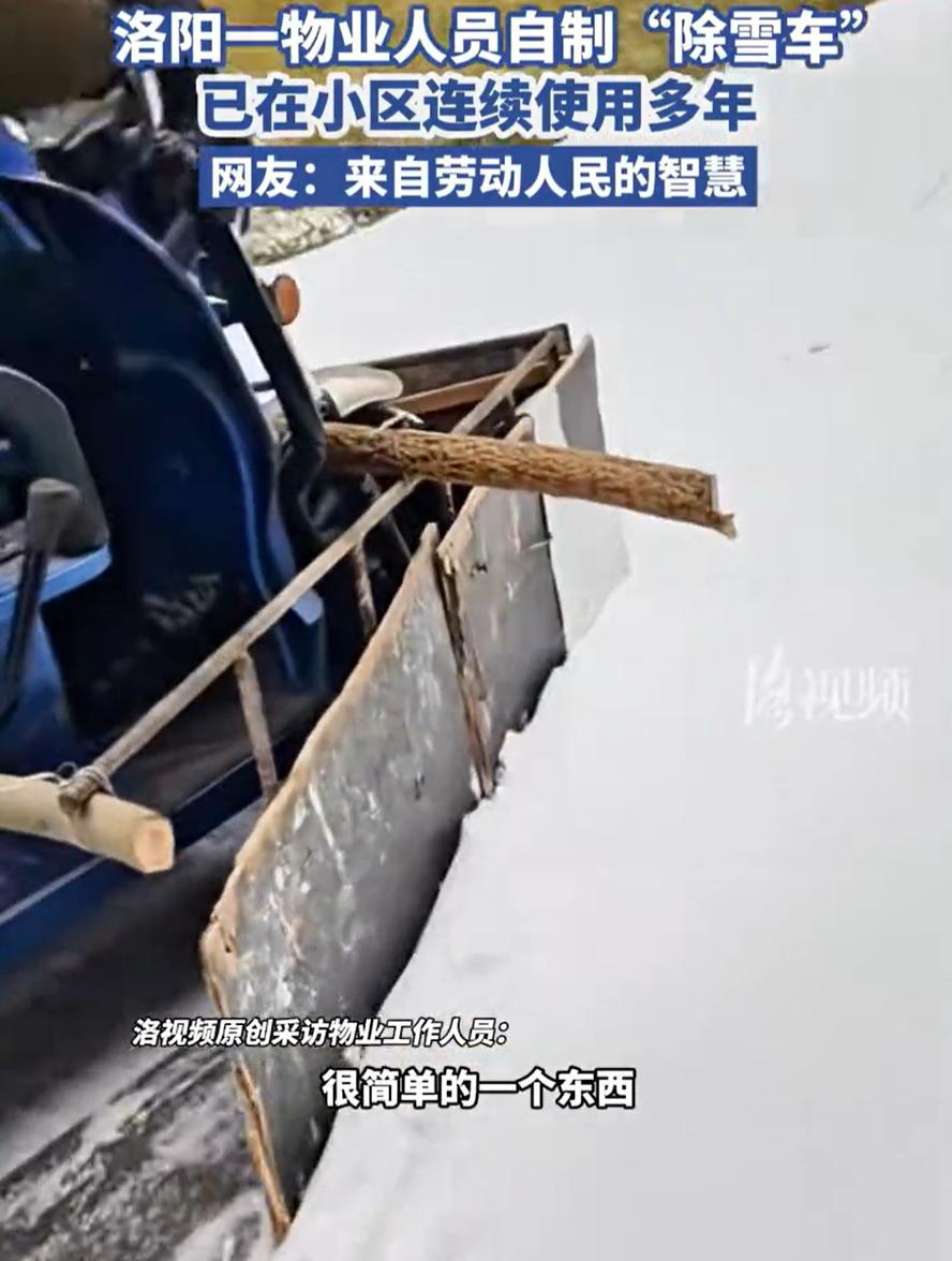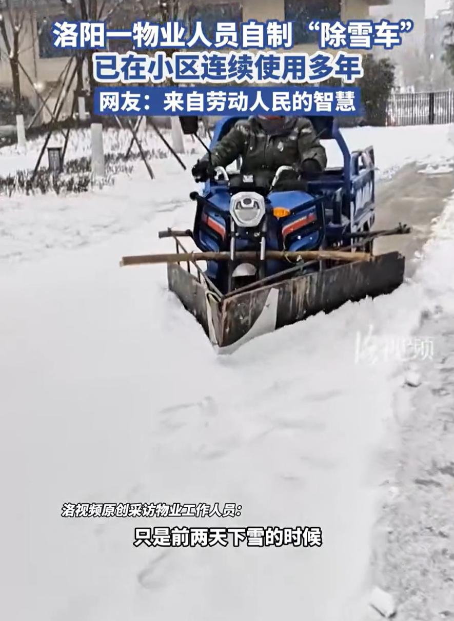 这个物业火了!河南洛阳,下雪后一小区物业工作人员来除雪,但他并没有用铲子一点点的弄,反而用三轮车自制了一个“除雪车”,绕着小区开两圈,道路就被清理出来了,网友:正规除雪车要没的卖了 其实这个自制的除雪车并不复杂,就是在一个电动三轮车上挂着两块木板,然后将两块木板呈V字型,只要三轮车开到的地方,雪就会被推到两侧,可以说办法简单粗暴,而且省心、省力,还不花钱 根据物业工作人员回应,这个自制的除雪车已经用了很多年了,这两天下雪后就随便记录拍了一下,没想到却意外的火了 对于此事,不少网友夸赞这是劳动人民的智慧,但也有些不懂的网友,提出了自己的质疑 有网友说:简单的事简单去做,省劲使用耐用并且合理,其实过段时间雪也会融化的。为什么要用那么多人力物力? 还有网友表示:除雪车原理就是这样,为什么还要花大价钱购买除雪车,这样做不就好了吗? 说实话,后两种观点,显然把除雪这件事想的过于简单了 首先,雪虽然最终会融化,但在雪未融化之前,它对交通、安全以及居民的生活影响却不容小觑。想象一下,早晨出门,如果路面结了厚厚一层雪,滑倒的风险大,车子也难以通行,甚至可能影响到紧急情况的处理,而且雪融化后还容易变成冰,及时清理才是对的 至于一些网友提到的“除雪车原理不就是这样吗,干嘛要花大价钱去买?”这个问题,虽然从表面看,这种自制的办法能解决问题,但现实中,除雪车不仅仅是把雪推开那么简单 除雪车的设计,通常会考虑到更广泛的应用场景,包括大面积的街道、不同种类的雪(比如湿雪、冻雪)以及长期高强度的使用。即便是小区里使用的这种“V字型”工具,它也无法应对复杂天气条件下的除雪需求,比如冰层或者积雪特别厚的地方。用这种方法处理少量雪没问题,但如果一场暴雪过后,积雪厚度达到几十公分,可能就不是一个三轮车能处理得了的了 所以,简单事也许能简单做,但一旦遇到复杂情况,简单的办法往往就不够用了