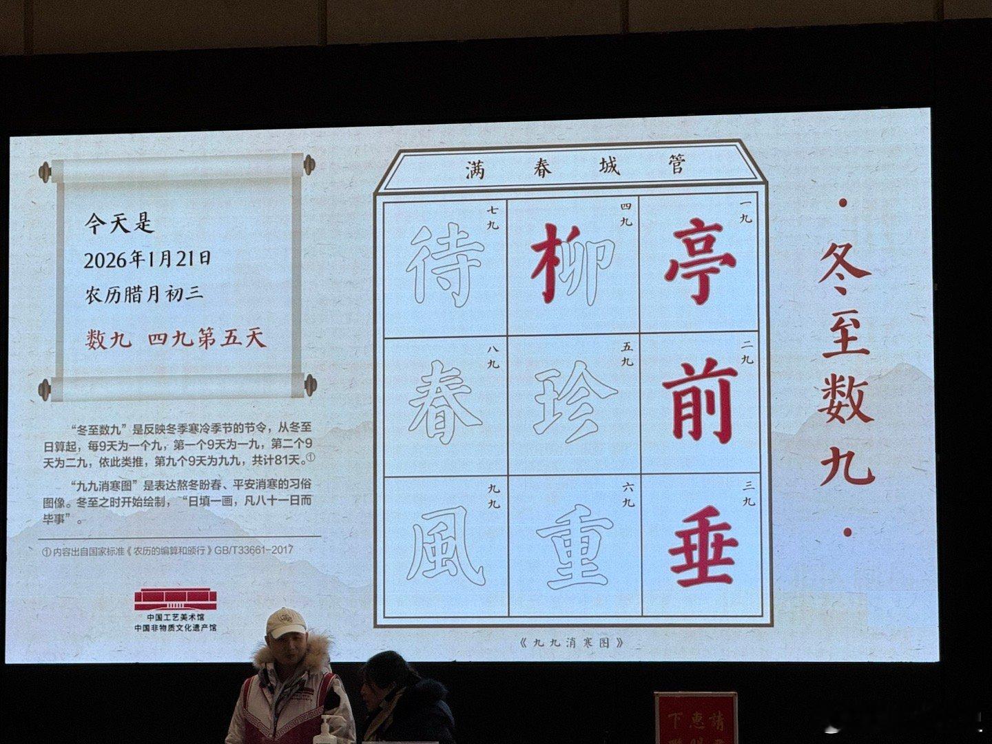 非遗过大年 工艺美术馆大厅的显示屏挺有意思,还有数九的图来给大家展示冬天到什么时候了,等写到“待春风”就开始暖和了吧