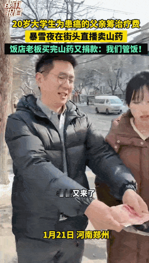 “太心酸了!”河南郑州,一20岁男生,大雪夜直播卖山药,冻得直搓手,本以为是作秀博流量的,结果男生却强颜欢笑说:“父亲得了重病想筹款,家里还有个上初三的弟弟。”网友问起母亲,坚强的男生却一下子哽咽了。 河南郑州下暴雪那几天,估计不少人都躲在暖气房里不敢出门,可就在这么冷的深夜,街头却有个20岁的男生,一个人站在雪地里直播卖山药。 路面上全是积雪,寒风刮在脸上跟刀子似的,他身上穿的衣服看着就不厚,双手冻得通红发紫,指尖都快没知觉了,只能不停地搓手、哈气,勉强取暖。 镜头里的他,脸上一直挂着不自然的笑容,看得出来,那不是真心的开心,是硬撑出来的。 他一遍遍地对着镜头说山药怎么好,语气里藏着一股急切,可直播间里一开始没多少人买账,评论区全是质疑的声音,有人说他故意找暴雪天卖惨,有人说他装可怜博流量,还有人嘲讽他年纪轻轻不务正业,就想着走捷径。 换做是普通人,被这么多人质疑,说不定早就崩了,可这个男生没反驳,也没辩解,只是默默地搓着手,继续介绍山药。 直到直播播了一段时间,他无意间提起家里的事,大家才知道,这个看似“作秀”的年轻人,背后藏着多大的难处。 他才20岁,还是个大学生,本该在学校里上课、和同学打闹,过着无忧无虑的日子,可命运偏要跟他开玩笑。 他的爸爸得了重病,躺在病床上,急需一大笔钱治病,家里还有个上初三的弟弟,马上要中考,需要人照顾,也需要花钱,一家人的重担,就这样硬生生压在了一个20岁的孩子身上。 有网友忍不住问他,那你妈妈呢?就是这一句话,彻底击溃了他所有的坚强。 前一秒还在硬撑着微笑的男生,瞬间红了眼眶,喉咙哽咽着,一句话也说不出来,那种无助和委屈,隔着屏幕都能感受到。 真相一出来,直播间里的评论区彻底反转了,之前质疑他的人,纷纷道歉,有人说“对不起,是我太刻薄了”,有人说“20岁的年纪,能扛起这么多,真的太不容易了”。 还有很多网友,直接下单买山药,哪怕自己用不上,也想帮他一把,还有人自发转发直播链接,呼吁身边的人伸出援手。 现在确实有很多人,靠着卖惨、装可怜博流量、赚快钱,久而久之,大家就变得越来越冷漠,越来越警惕,生怕自己的善意被利用。 可我们不能因为少数人的恶意,就否定所有身处困境的人,更不能用自己的偏见,去伤害一个拼尽全力活下去的人。 这个男生最可贵的地方不是他有多可怜,也不是他有多值得同情,而是他身处绝境,从来没有想过伸手乞讨,没有想过靠别人的施舍过日子,而是选择用自己的双手,靠卖山药一点点筹款,哪怕在暴雪天冻得瑟瑟发抖,也没有放弃。 一场重病,就能压垮一个普通家庭;一句质疑,就能击溃一个年轻人的坚强,这个20岁的男生,他只是想保住自己的爸爸,只是想让自己回家的时候,还能叫一声“爸”,这有错吗? 如果你刷到这个男生的直播,你会选择下单帮他一把,还是会继续质疑他? 信息来源:都市报道