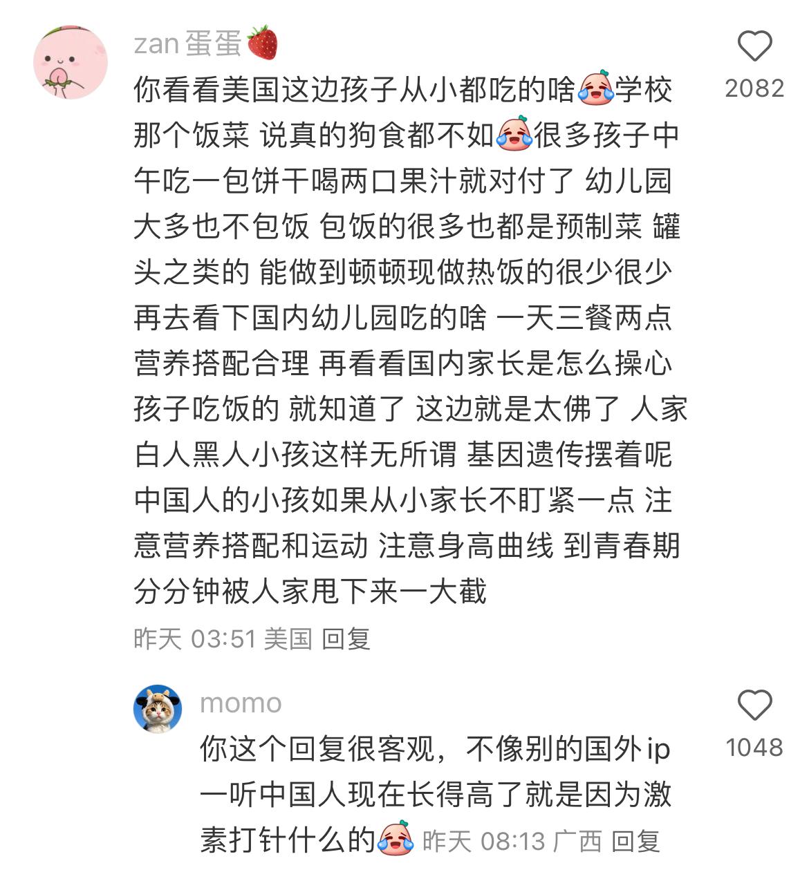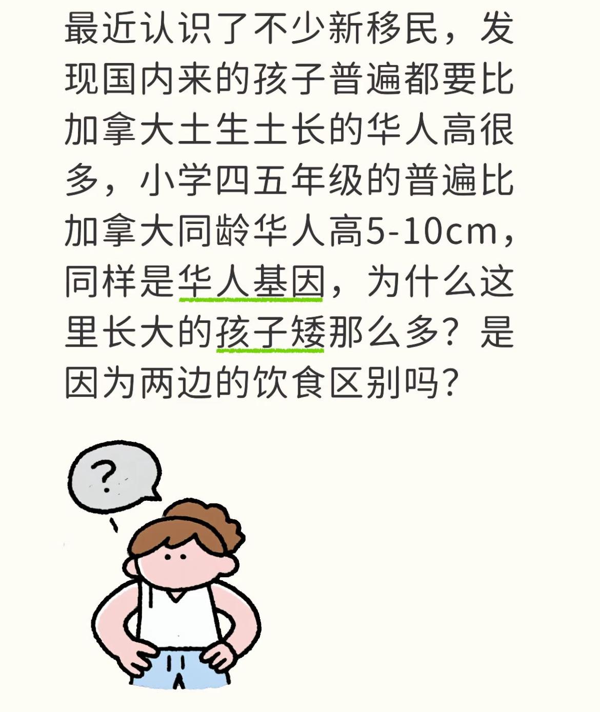 有华人问:为什么现在国内的孩子比海外华裔孩子的身高更加高?她发现华裔小孩普遍都比较矮,同样是华人基因为什么差那么多 有些人会酸着说国内孩子打针所以高,有一个高赞评论说得很有道理,看看外国的饮食就知道了,每天吃的都是各种科技食品,甚至拿零食当正餐吃,华人又不像外国人的基因,可以随便吃这些就能长高,国内小孩的家长每天在饮食方面都很注重的