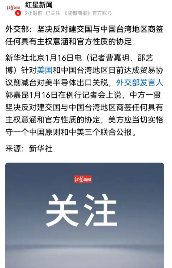 这是动手的前奏!大陆直接否认美台协议,统一的倒计时已经敲响?过去台湾和外界签协议时,大陆大多选择睁一只眼闭一只眼,但现在开始明确否定台湾与任何一方签署的协议,也就是说,台湾根本没有资格签署这类协议。   1月15日美国商务部和台湾公告达成所谓投资合作备忘录,台湾宣布要为美国半导体行业投入5000亿美元,一半来自企业直接投资,一半来自台当局的信用保证,这个资金规模对台湾来说是一个巨大的压力,几乎是拿全部家底去支持美国产业,半导体一直是台湾手里的王牌,但现在不仅资金流向美国,技术和产业链也向美国倾斜。     看看美国的回报,只有将台湾出口至美国的关税从20%降到15%,并且不再享受额外优惠,这样的条件不管怎么看都不像等价交换,拿自己的核心利益换对方一句客套话,这样的决策让人难以理解。     大陆的反应非常快,16号外交部发言人郭嘉昆明确表示,与中国建交的国家,不允许和台湾签任何官方性质的协议,随后的1月21日,国台办发言人彭庆恩直接否定了协议的效力,说白了就是大陆不认这类操作,这种立场上的转变,体现出大陆正在计划一步步扫清法理障碍,为统一做准备。     从国际法来看,大陆拿出了包括《开罗宣言》《波茨坦公告》《日本投降书》和联合国2758号决议等法律依据,已经把台湾的归属问题说得很清楚了,台湾没有以“国家”名义签署这类官方文件的权利,大陆把这些国际文件重新摆出来,就是要告诉全世界,未来任何私下同台湾签的官方协议都不会被承认。     美国这次是在解决自身制造业难题,另一方面也想通过和台湾进行经济“捆绑”,把台湾作为牵制大陆的一枚棋子,其实,美国无视中美联合公报中的承诺,与台湾进行表面非官方、实质却带有主权性质的合作,只会让两国关系更加复杂。     更令人感叹的是台湾当局的选择,台湾和大陆的贸易往来远超台美之间的贸易,岛内就是靠着大陆的市场和需求支撑经济发展,现在台湾却把自己多年的积蓄送去美国,还要把关键技术和产业链一起交过去,明明把所有资本和未来都压在了美国那边,结果却只有一点点贸易减免,这样的算账方式只会让台湾失去更多主动。     这次大陆突然否定协议,也是给一些想要通过台湾问题谋利的国家提个醒,界限已经画清楚了,谁越线,后果自己承担,统一、不可分割的信号已经越来越明确,相关准备正在一步步推进,法理清场、外部干涉链条断开、主权归属不断强调,这些措施都是为将来做铺垫。     眼下关于台湾的走向已不再是空谈,而是真真切切地摆上了台面,大方向已经确定,统一不再是纸面上的愿景,而是一个正在发生的现实。     欢迎大家在评论区说说,你怎么看最近台湾的变局?     本文首发于卖行家的小报纸。