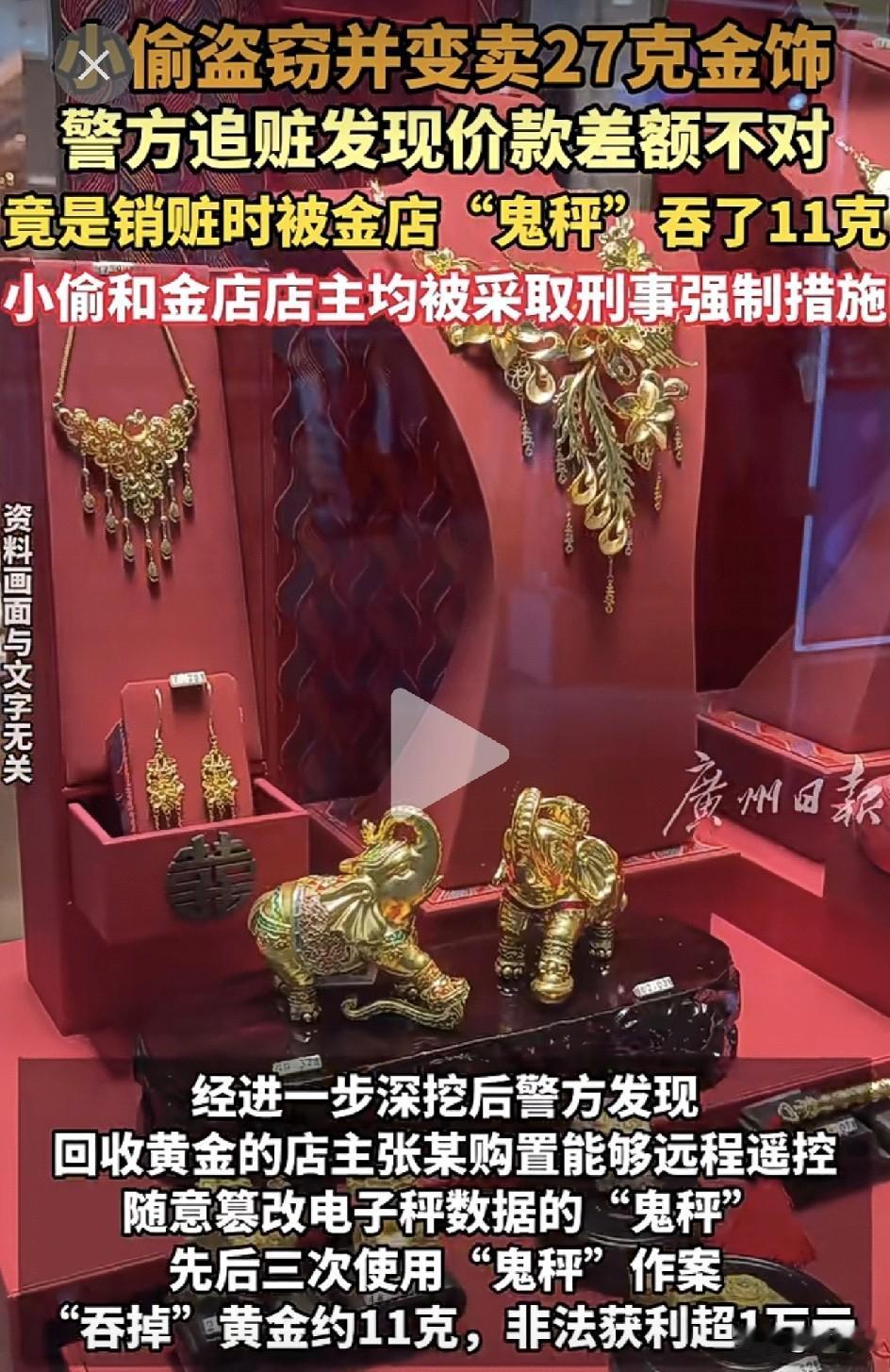 黄金大盗遇上“鬼秤”老板,销赃反被黑吃黑!警察都看乐了:一锅端! 最近湖南株洲发生了一出“黑吃黑”的魔幻大戏,电视剧都不敢这么编! 🎬1️⃣:赌徒的“精准”盗窃 陈某,沉迷网络赌博手头紧,居然把歪主意打到了借住的朋友罗女士身上。 他趁人不备偷摸藏了把备用钥匙,等罗女士一家出门旅游,大摇大摆上门“扫货”,分三次偷走了大约27克黄金首饰,价值近3万块。 🎬2️⃣:当小偷遇上“高科技”骗子 偷是偷到手了,怎么变现呢?陈某找到一家金店主张某。没想到,这才是“惊喜”的开始! 张某老板笑眯眯地接过金子,掏出一个看起来很专业的电子秤。轻轻一按,金子“缩水”。三次交易,27克金子硬生生被“称”走了11克,张某白赚一万多。 🎬3️⃣:警察叔叔的“案中案” 罗女士回家发现被盗马上报警。警方效率超高,当天就锁定了陈某。可追赃时发现:哎?赃物金额怎么对不上? 这一深挖,好家伙,拔出萝卜带出泥!直接把用“鬼秤”的张某老板也揪了出来。 现在俩人都进去了,一个涉嫌盗窃,一个涉嫌诈骗,堪称“黑吃黑”界最佳搭档。 网友辣评: “这是什么双向奔赴的牢狱情缘?” “小偷:警察同志,我举报!他骗我!” “鬼秤老板:没想到骗到同行身上了……” “建议他俩监狱里开个‘诚信经验交流会’。” 年底了,各路妖魔鬼怪全都出动了,提醒大家: 🎊家里钥匙保管好,出门锁门要检查。 🎊卖金银首饰务必找正规店铺,最好自己先称一下。 🎊科技发达了,“鬼秤”都能遥控了,多留个心眼总没错! 正所谓:偷金遇黑秤,黑吃黑;警察一锅端,全带走! 素材来源:广州日报,侵联删!
