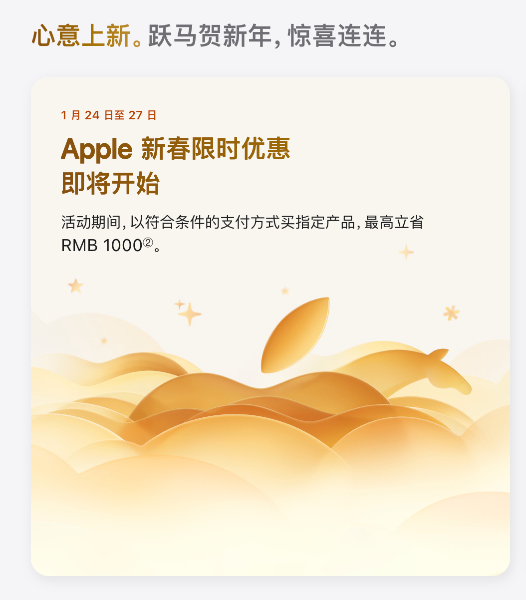 苹果推出新春优惠=清库存,第三方的iPhone17系列都优惠大几百了,官网竟然不参与,只把老款Mac和iPhone16拿出来清库存,同时还不能叠加国补和教育优惠,离谱。