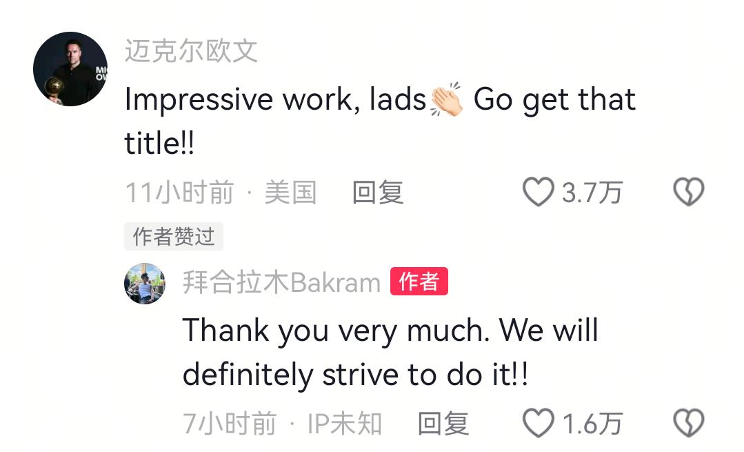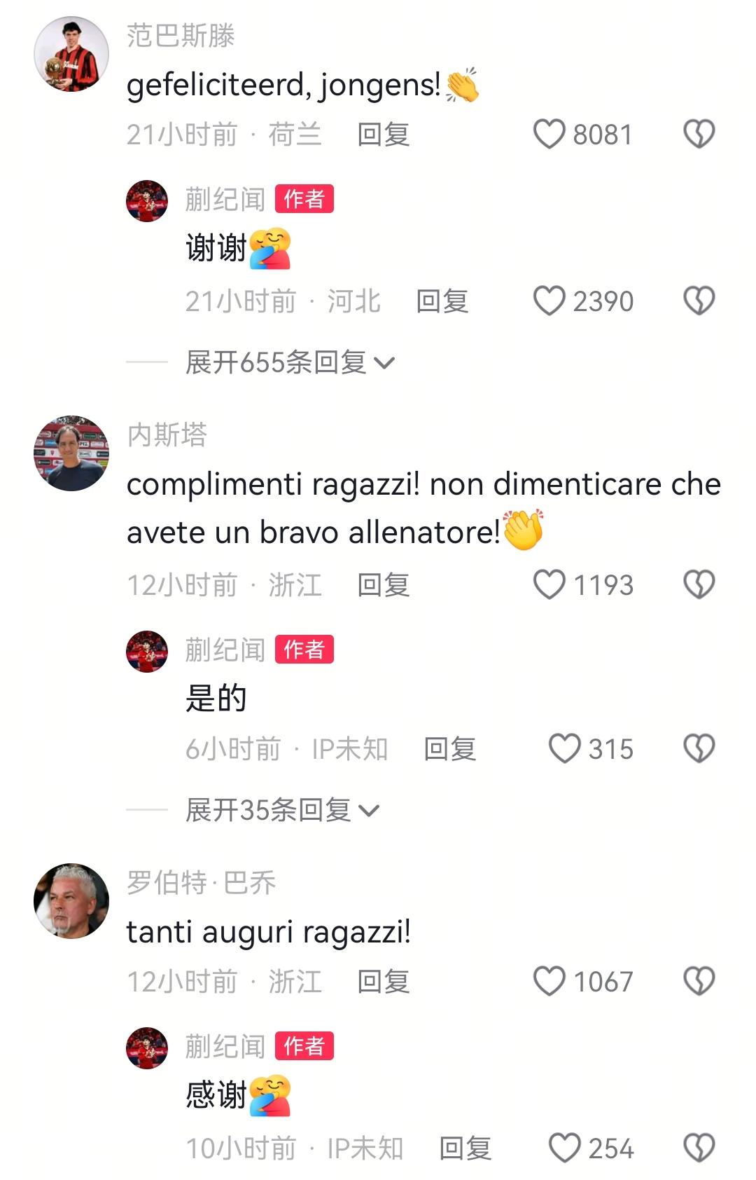 说出来也许你不信!一帮国际球星比我们中国球迷还关注我们的U23队! 中国队首次晋级U23亚洲杯决赛后,多名球员纷纷在社交平台发文庆祝。内马尔、切赫、巴乔、马特拉齐等多位足坛名将更是在王钰栋、拜合拉木、李昊、蒯纪闻、彭啸的帖子评论区现身,与他们展开热情互动。