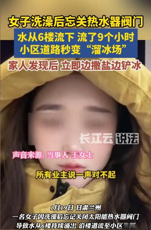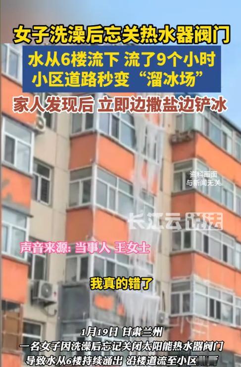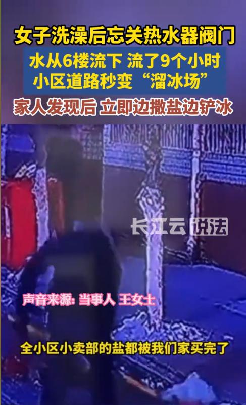 “笑不活了!”近日,甘肃兰州,一女子洗完澡忘了关太阳能热水器水阀,没想到一夜后,小区楼下竟结满了冰,女子父亲晨起锻炼时,才发现是自己孩子闯的祸,赶紧叫家人起来铲冰,甚至搬空了小卖部的盐!网友:人怎么能闯下这么大的祸! 北方的冬天气温很低,室外甚至能达到泼水成冰的程度,因此用水要留心,如果一时大意,可能就会给邻里添不少乱子。 据媒体1月20日报道,王女士家的太阳能热水器上水的时候会漏水,但是一家人都没有发现。这天晚上8点左右,她像往常一样打开太阳能热水器洗澡,可洗完澡时,刚好有人打来电话,于是她便忘记了关热水器的阀门。 就这样热水器漏水了一个晚上,由于是冬天室外温度很冷,水流到外面后迅速结了冰。第二天早上六点时,王女士的父亲晨起锻炼,一推开楼下的门才发现小区外面变成了“溜冰场”,地面全是冰。 他想着应该是谁家漏水导致的,赶紧找到告诉一声。没想到找了一圈下来竟发现是自己家。于是赶紧把家人喊起来“收拾残局”。于是一家人拿着工具一起到楼下铲冰,,为了尽快清理路面,他们甚至把小区小卖部的盐都买空了。 王女士更是被父亲从被窝中揪出第一时间向小区各位业主道歉。网友看后表示,这大概是今年最接地气的“公益冰场”了,就是有些费盐。也有网友调侃道,26年第二个闯大祸的人出现了。 信息来源:《女子洗完澡忘关水阀,一夜之间小区道路变“溜冰场”!当事人致歉。》长江云说法