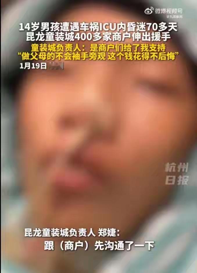 14岁男孩车祸后在ICU昏迷70天,太让人心疼了!没想到杭州昆龙童装城400多商家超给力,自己还背着冬装库存压力,却12小时凑出10万5千块救命钱,这暖心事看得人眼眶发热! 发起者郑婕本来只预估两三万,结果大家你两百我一千地接龙捐款,全是实打实的善意。关键时刻还是这些普通人的伸手帮忙,给困境里的家庭撑了把伞,希望小锦豪能早点醒过来!