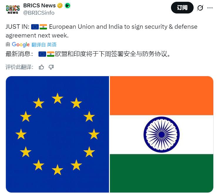媒体消息:欧盟和印度将于下周签署安全与防务协议。 网友:欧盟总是高谈阔论“战略伙伴关系”,直到面临压力才会停止。我认为对印度而言,这笔交易是谈判筹码,而非忠诚的体现。在与美国发生一系列混乱之后,他们现在肯定会寻找其他出路。