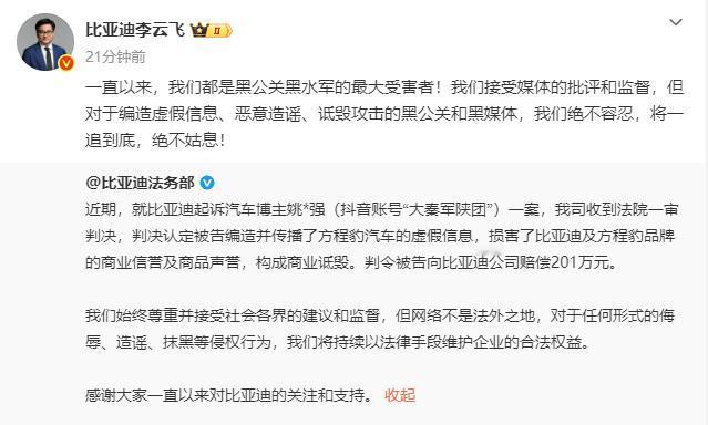 汽车博主姚某强(抖音账号“大秦军陕团”)因编造并传播关于比亚迪方程豹汽车的虚假信息,被法院一审认定构成商业诋毁,判令其向比亚迪公司赔偿201万元。[惊呆] 对此,比亚迪集团公关处总经理李云飞明确表态:“对于编造虚假信息、恶意造谣、诋毁攻击企业的‘黑公关’和‘黑媒体’,我们绝不容忍,必将一追到底,绝不姑息!” 据财知观察,“大秦军陕团”账号长期以发布坦克系列车型的越野内容为主,目前拥有粉丝约150万。 在相关判决公布后,有网友在其评论区晒出判决书截图,并调侃留言:“这201万,长城给报销吗?”[捂脸]
