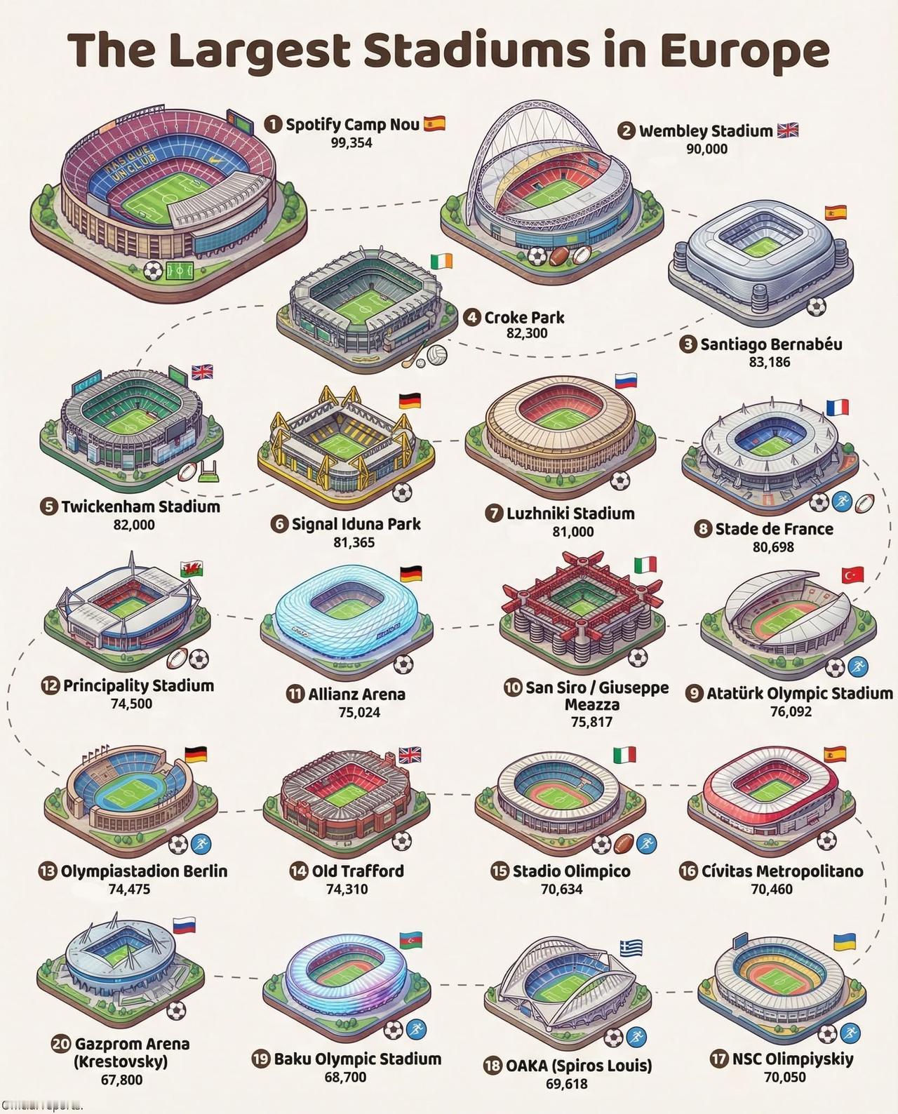 球场大,真的就代表伟大吗? 诺坎普第一,没悬念。 但真正让人起反应的,是后面的顺序。 温布利9万人,却常年被吐槽“没氛围”; 伯纳乌容量不算最大,却是欧冠历史的权力中心; 多特的西格纳伊度纳公园只有8万出头,但一到比赛日,声浪能把电视机震裂。 更有意思的是—— 老特拉福德排到14位,可它在很多人心里,依然比前十的一半更有“足球重量”。 还有一些场馆,严格来说甚至不是纯足球圣殿, 但一到国家队或决赛,就成了历史现场。 所以问题来了: 你去球场,是为了“坐满多少人”, 还是为了“那90分钟值不值得被记住”? 容量是数据,氛围是信仰。 而真正的豪门球场,从来不只靠数字说话。 足球数据排行